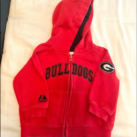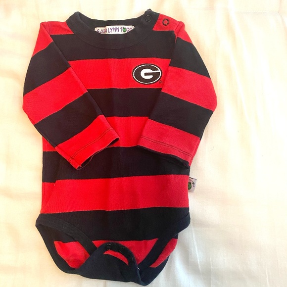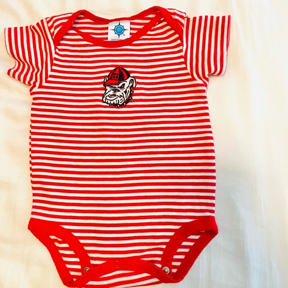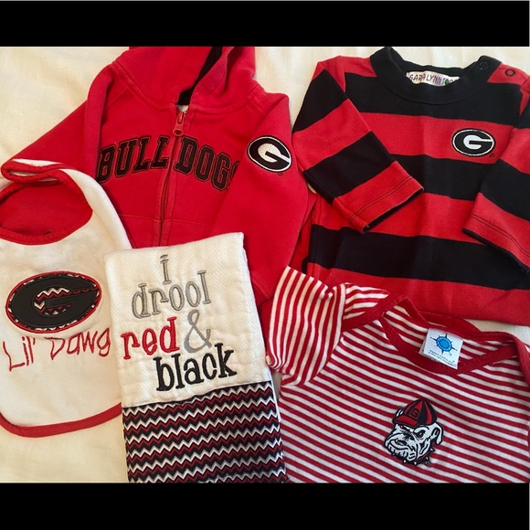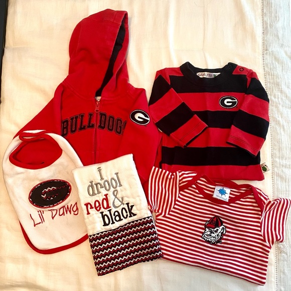 5 boutique and custom made UGA baby boy pieces includes a zip up hoodie sweatshirt (12m), long sleeve onesie (12m), short sleeve onesie (9m), burpcloth and bib. All NWOT/EEUC except for the bib, which has a few untreated stains. Go Dawgs!