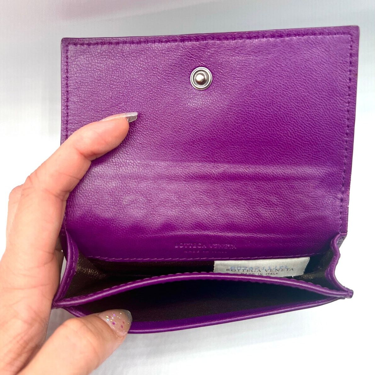 Brand: Bottega VenetaItem: Cardholder/Wallet Details: -Two pockets for cards, one pocket for cash, and one back pocket for cards-Snap closure Condition: Very Good-No stains or tears -Minimal scratches -Front leather is only worn over the snap closure (noticeable in photos)