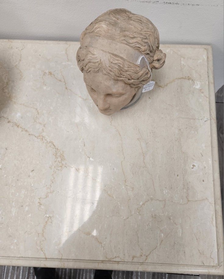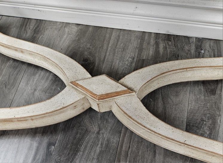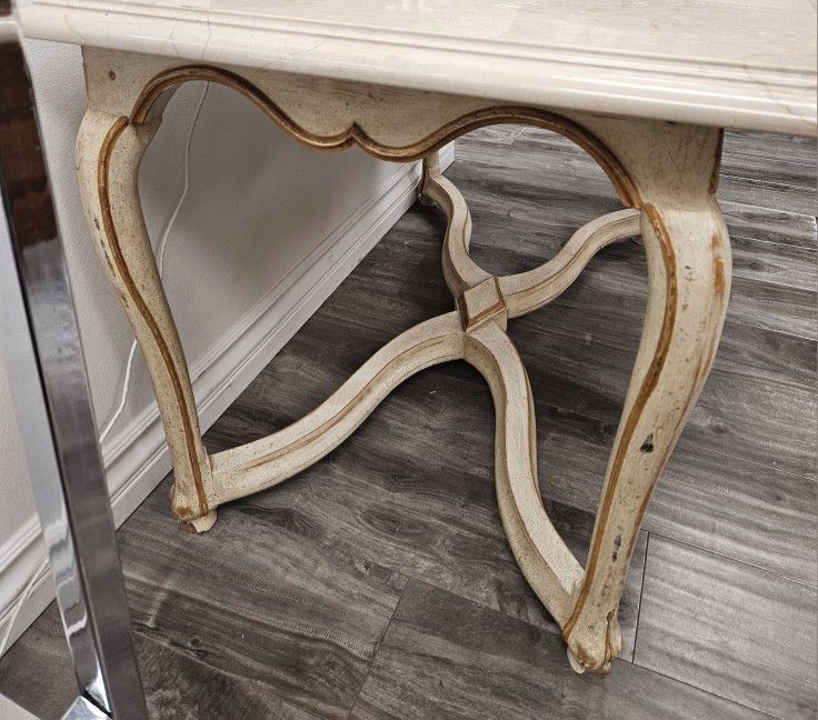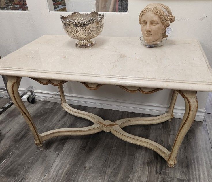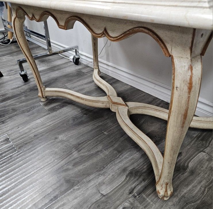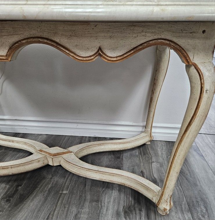 Elegant antique style genuine ivory marble console features a carved wood base accented with copper accents. Perfect for displaying decorations and everyday essentials with both beauty and functionality. Marble is beveled with rounded edges.In good used condition. 43 12" W x 25" D x 25" HPrice was $595 - Sale Price Now $385