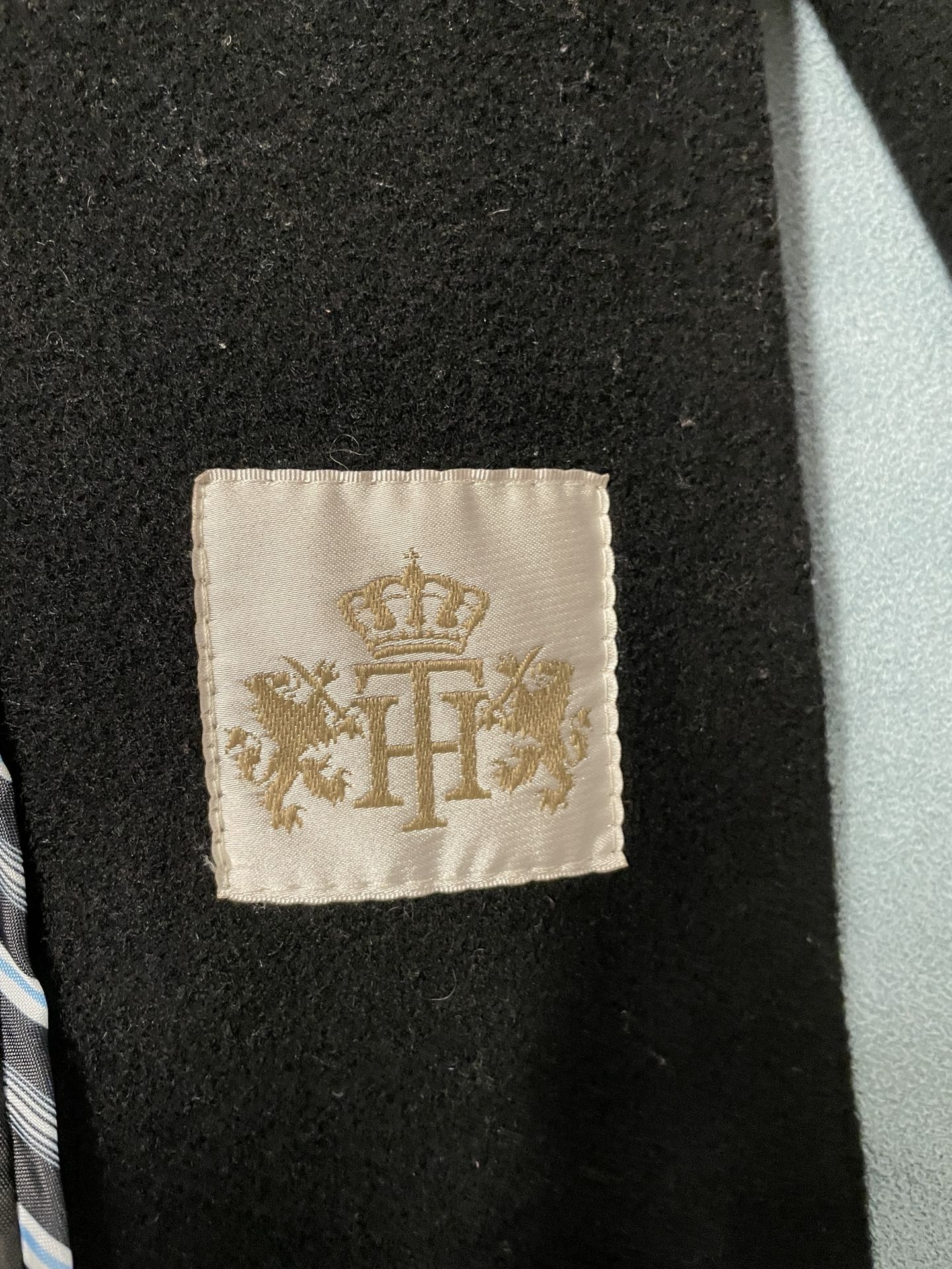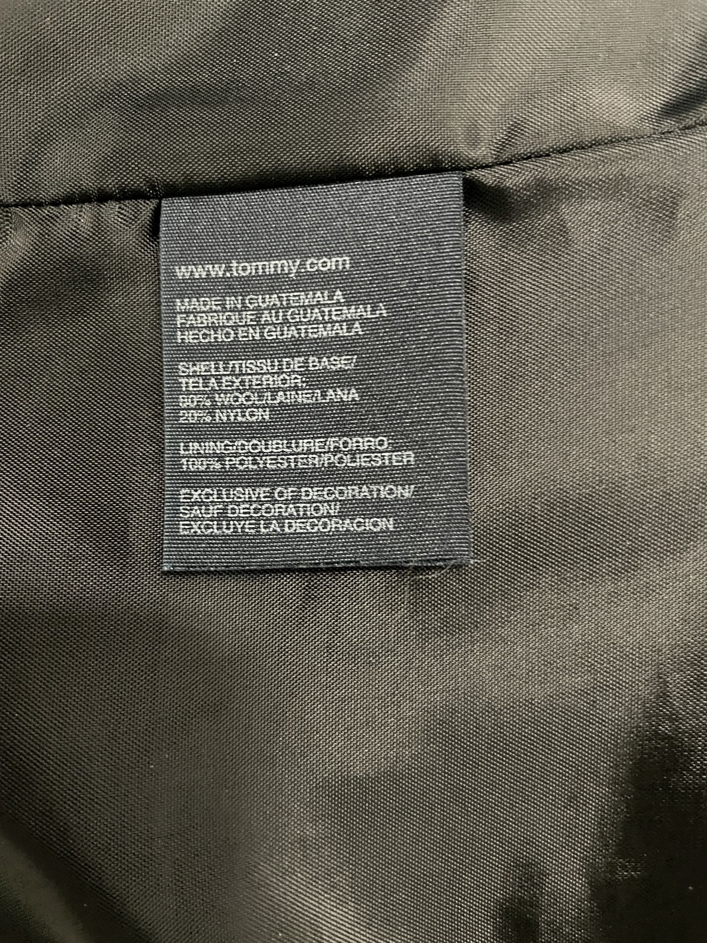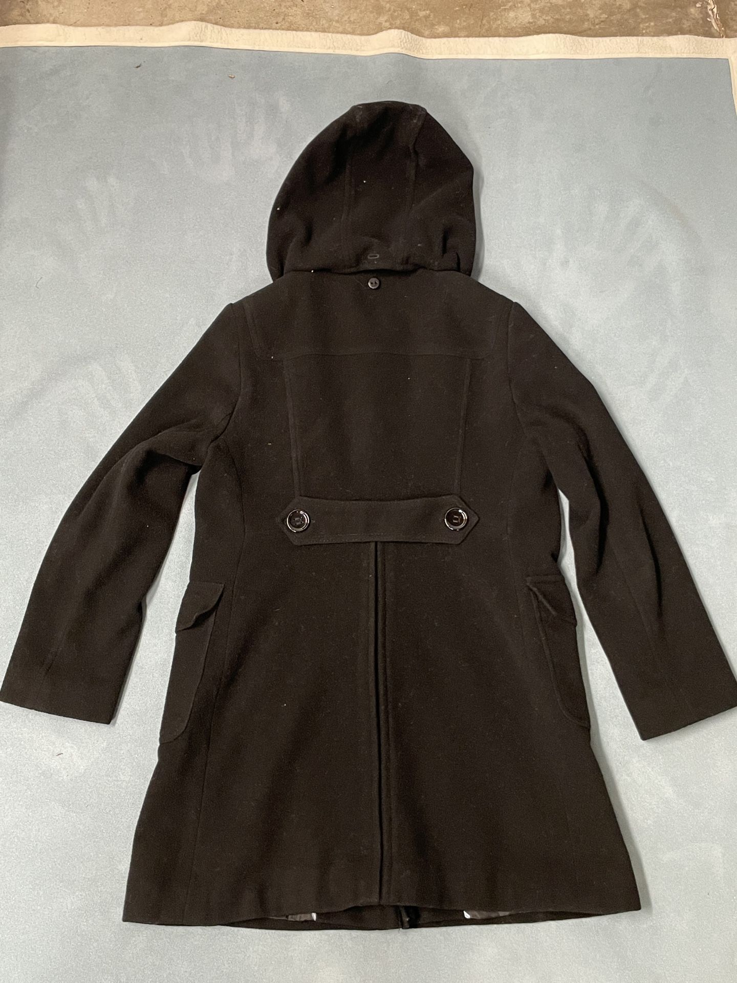 I am selling a Pre-Owned Women´s Black Wool Blend Pea Coat Size 10. It is pre-owned. The coat is size 10. It is black. The coat is a 80% Wool 20% Nylon. The coat has a zipper down the front of it, there is a flap that covers it and the flap has 3 big black buttons to keep it closed. On the front of the coat there are two buttoned pockets. The coat has a hood that is removable and attached with buttons. The lining of the jacket is 100% Polyester. On the inside of the jacket there is the logo patch, there is also an inside buttoned pocket. On the back of the coat there are two buttons. The coat is in very good condition, I lint rolled it but there is more lint to be removed, just be aware of that when you purchase it.