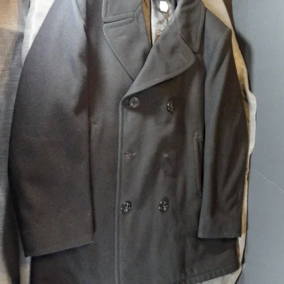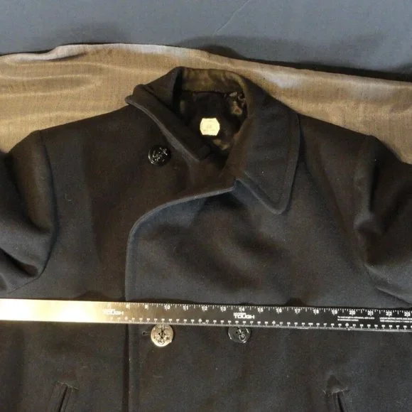 SV 1034USN NAVY ISSUE MENS BLACK WOOL OVERCOAT 46R PEACOAT 8405-01-154-5800SIZE: 46RCONDITION:PRE-OWNEDDEFECTS: MISSING 2 BUTTONS