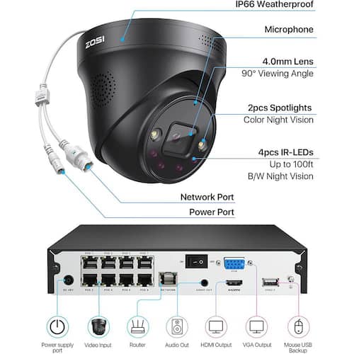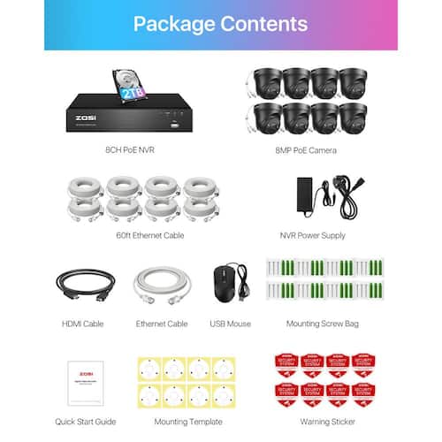 About This Product:ZOSI surveillance systems are designed for your home and business with easy installation and operation, this POE system features 4K Ultra HD day and night, real time 2-way audio, AI human detection, Instant push alerts, customize your each camera with 4 different recording modes, smart playback and searching, etc., the advanced H265 plus video compression technology provide you more faster loading speed, 50% less storage space and lower resource/data consumption. With free ZOSI Smart App, you can keep tabs on what´s happening at your home or business on your PC, Tablet, Smartphone anywhere and anytime.