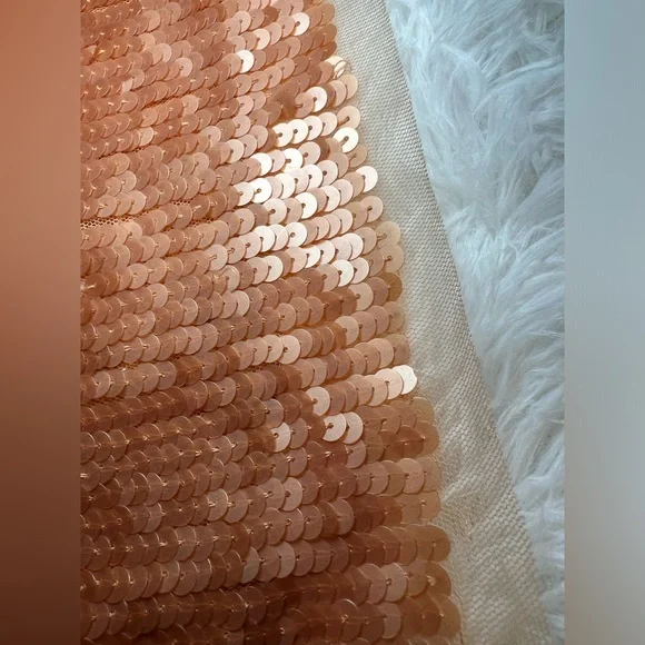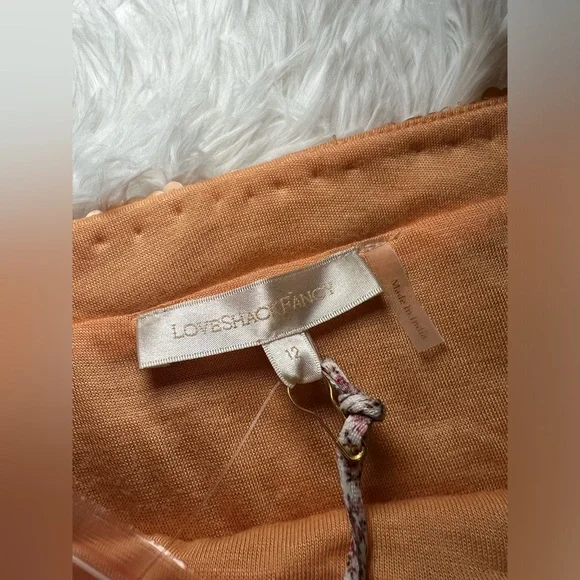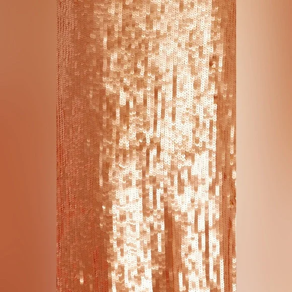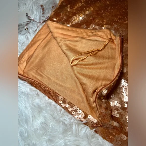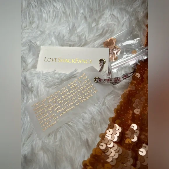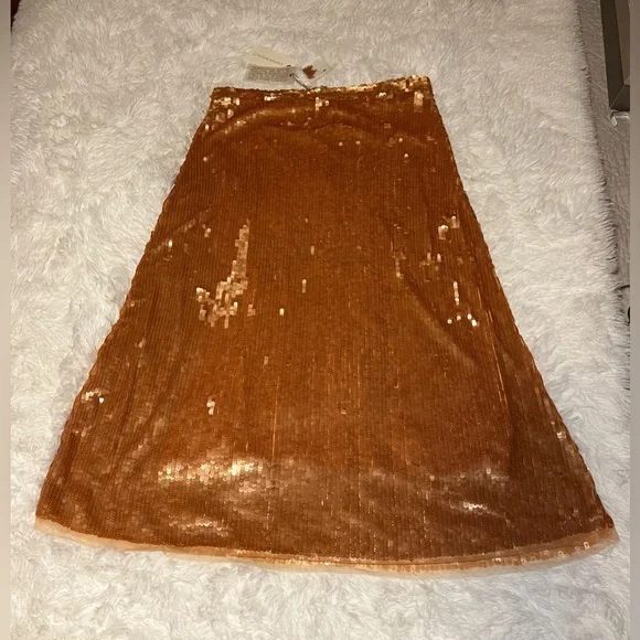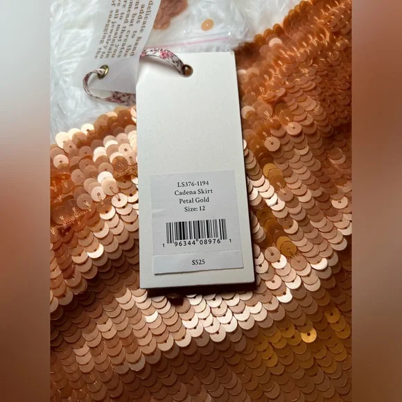New with tags Love Shack Fancy brand Cadena Petal Gold Sequined Skirt Sz 12. Stunning coppery a-line sequin midi skirt, with delicate tulle edging on the hem. Side zip closure. Spare sequins included. I personally purchased this item from Love Shack Fancy, and it has been stored with care in our clean, smoke-free home.