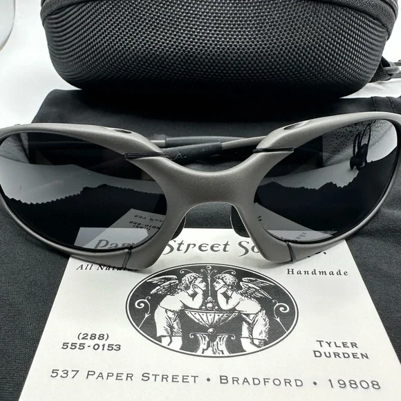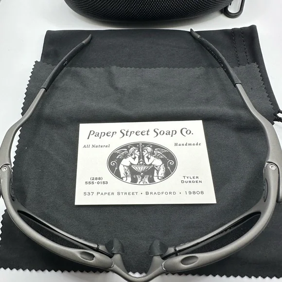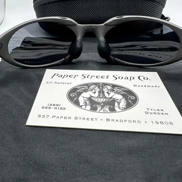 ****PLEASE NOTE THESE ARE PAPERSTREET SHADES********PLEASE NOTE IN THE FILM SEVERAL DIFFERENT COLORED LENSES WERE USED IN THE SUNGLASSES IN DIFFERENT SCENES****These sunglasses come with a Paperstreet soap business card (as seen in the movie) and with a special message written on the back. See last photoCleaning out some of my Fight Club collection and I am selling brand new Paperstreet Shade sunglasses like the ones Brad Pitt wore in Fight Club.Paperstreet shades is a collector´s dream. These shades were produced in very limited quantity back in early 2000 shortly after Fight Club´s release.The sunglasses are like the original screen used version. As seen in the scene depicted in the first picture.They have similar weight, look, and dimensions at a fraction of the cost.So why pay the marked up price when you can buy Paperstreet shades for a fraction of the price? Thats why these were produced in such limited quantities. Now is your chance to own a brand.These have the exact color lens that Brad Pitt wore in Fight Club as it was used from the same file that was seen on screen. The sunglasses have never been worn before and are completely new. They have only sat in my collection for years.It features a multi colored SMOKE lensThis auction comes with a CLEANING CLOTH AND ALSO A ZIPPER CASE