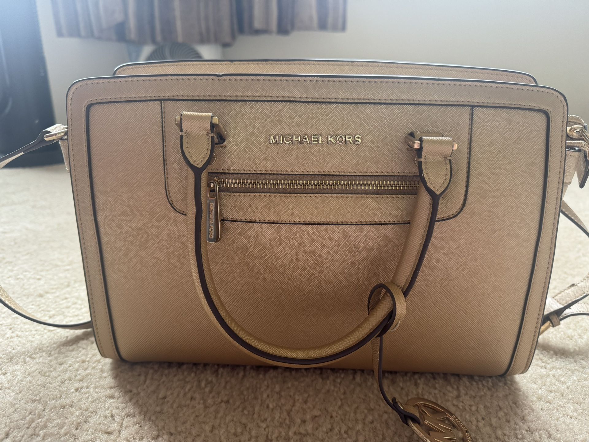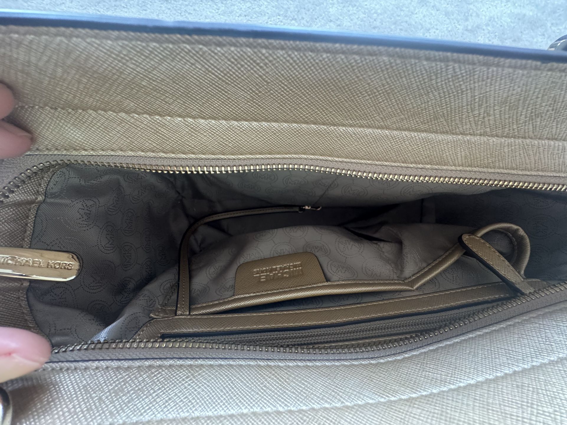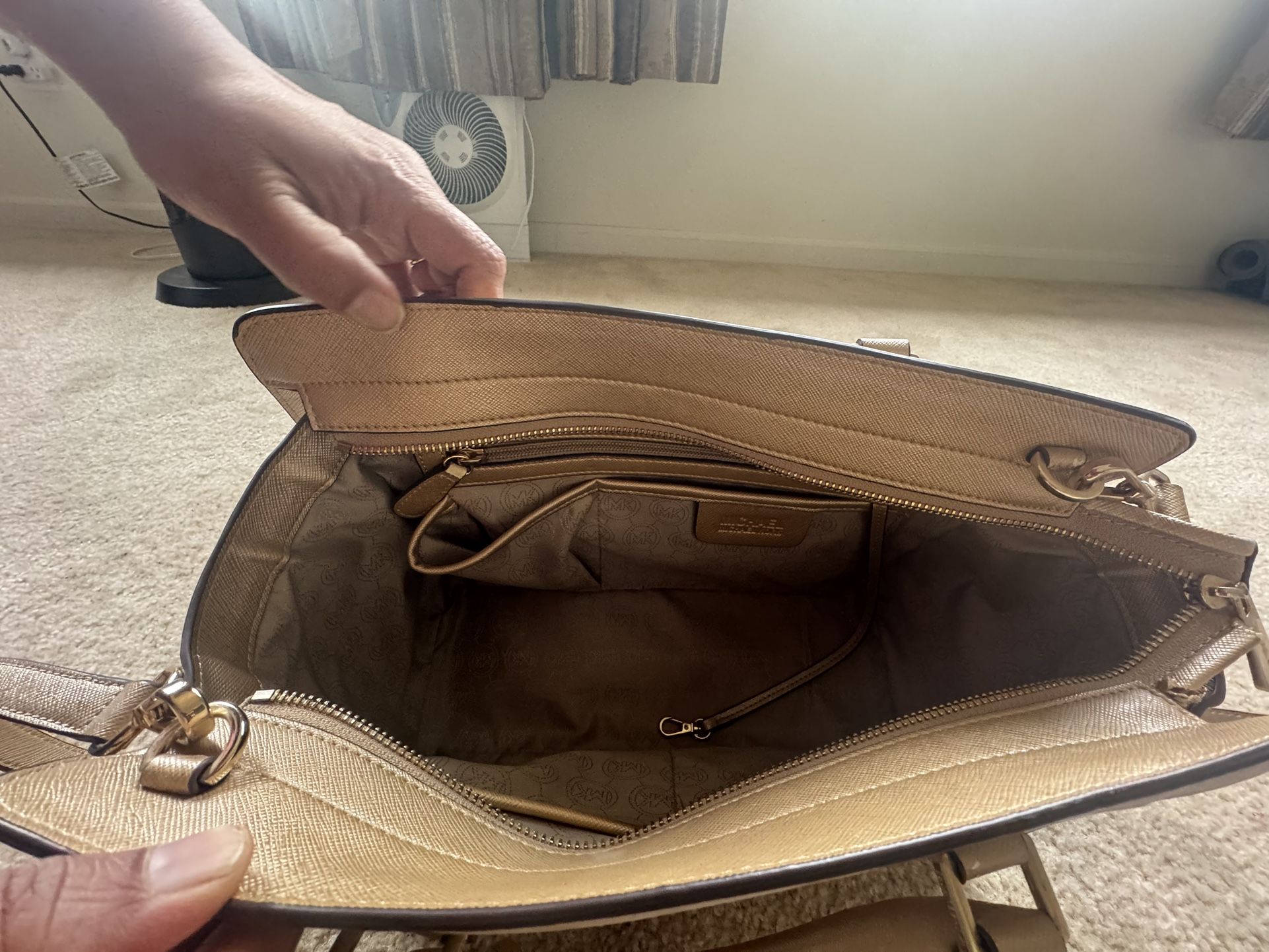 Once used. Gold color. Many pockets. Zipper closure.