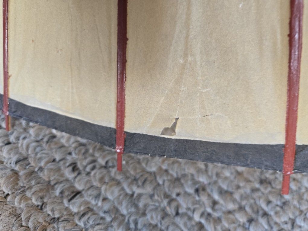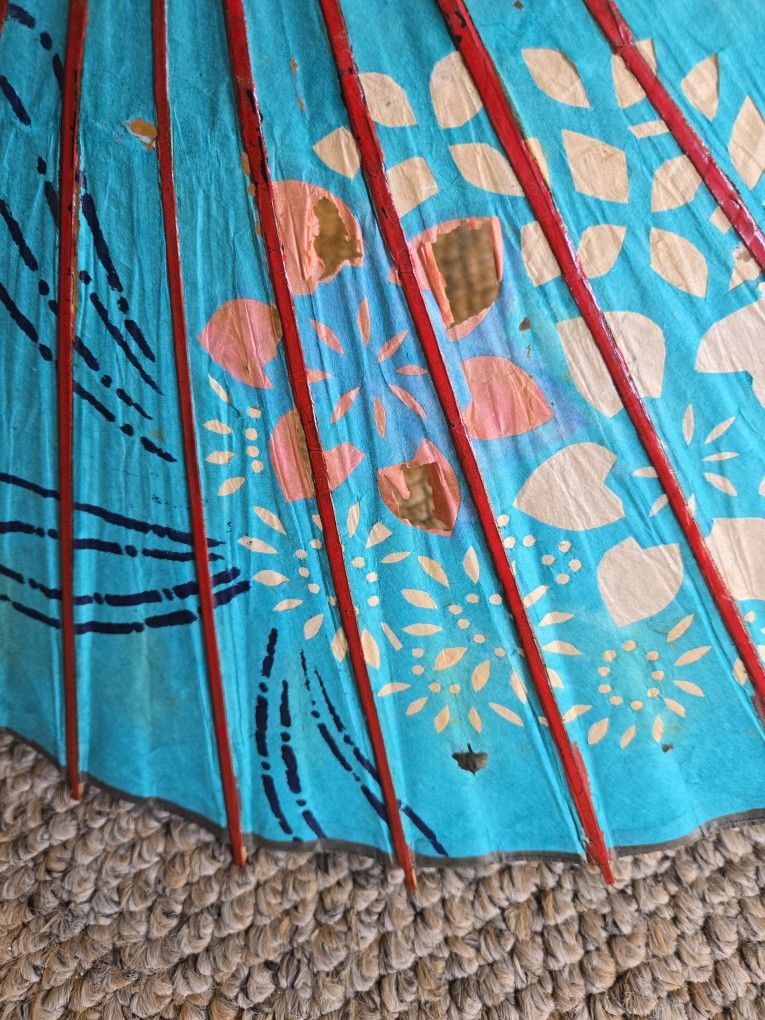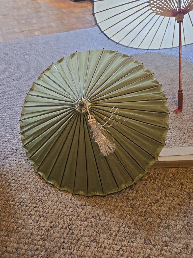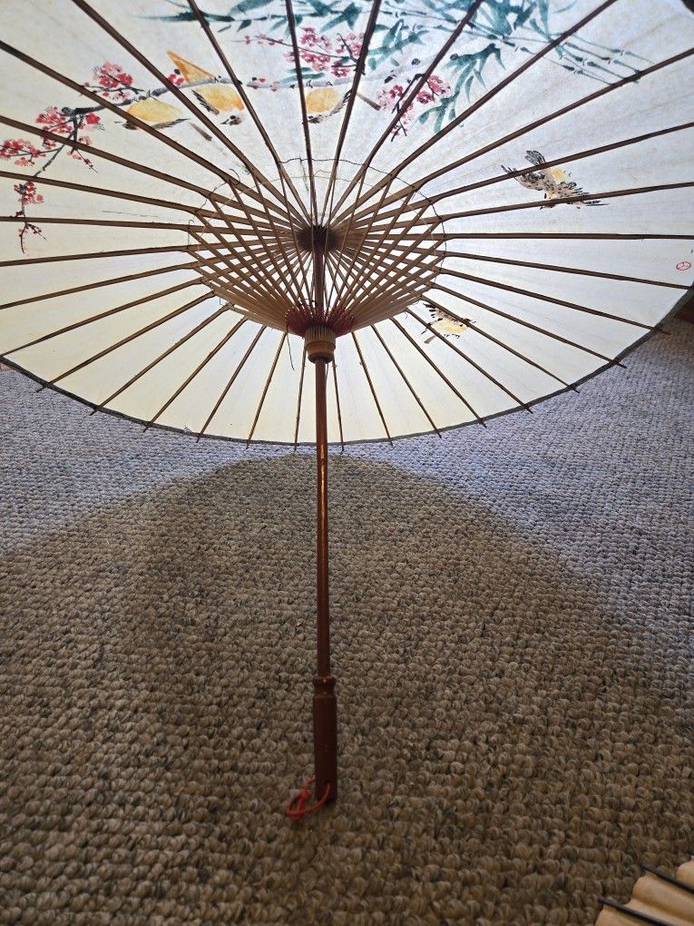 Umbrellas made with bamboo base and hand painted designs on paper make these unique and desirable. The large is about 30" wide. The blue is about 25" wide. They fold up and lock in place when up. Because of thier age there is some wear. Please look at photos The Shoji Lanterns are authentic. The green one is in good condition and retracts to form . The beige one will not expand into shape. This is a nice collection.