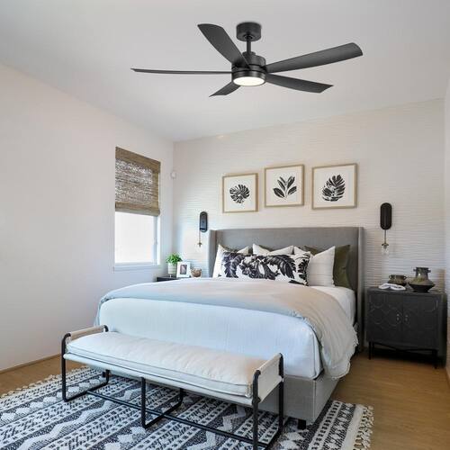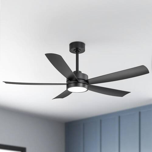 About This Product:The 52 in. Ezekiel ceiling fan delivers modern styling and dependable performance in a compact design. The stark matte black finish is complemented with 5-ABS blades in matte black finish to enhance your smaller room indoor living spaces. The Ezekiel features an integrated color-changing LED light kit with a frosted white twist and lock acrylic shade for easy installation. Control is at your fingertips with the included remote to operate the fan´s 6-speeds and light (on/off/color-changing). A wall cradle is included to store the remote when not in use.