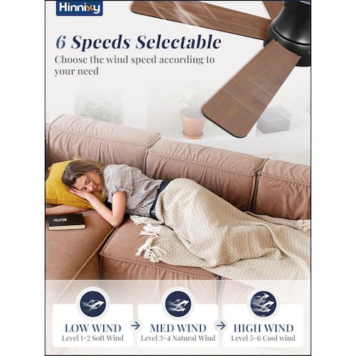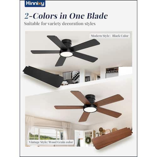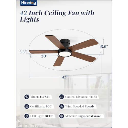 About This Product:The HINNIXY Black 42 in. flush mount ceiling fan is designed with the latest technology. It features 5 dual-color finishes (black and wood grain), which can be flipped to seamlessly match your room decor. The fan comes with a fully-functional handheld remote control, offering 6 fan speeds, reversible direction, 3 color temperature options (3000K warm light, 4500K natural light, 6000K cold white light) and 3 timer settings (1/4/8 hours). Powered by an energy-efficient DC motor, the fan operates at less than 35 dB, ensuring a quiet environment for your rest. Crafted from high-quality engineered wood, it guarantees durability. The integrated 18-Watt LED light source is both energy-efficient and long-lasting. We provide a 1-year warranty and detailed installation instructions. Our team is always available to assist with any questions during setup or daily use.