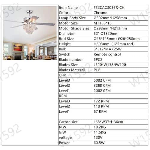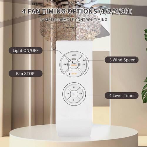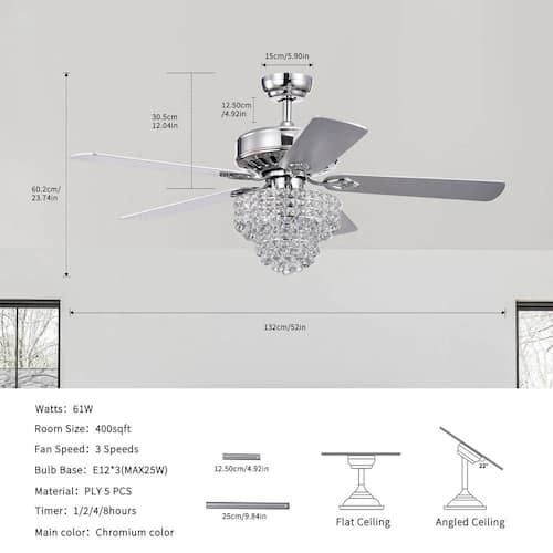 About This Product:Elevate your room with this new fan, Modern ceiling fan and crystal chandelier 2 in 1. 3 speed high-quality pure copper motor delivers optimal airflow with quiet performance. Reversible motor can be run in Winter help circulate warm air and cutting down energy costs. Different type of finish on each side of blades, pick the style that best fits your space, This fan can be hung with the standard mount or on angled ceilings (max angle: 15°), 2 down rods included (4.9 in./9.8 in.).
