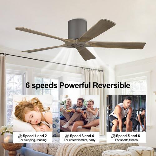 About This Product:The flush mount ceiling fan delivers ample airflow into interior living areas with its 5 solid wood bladed design that reach a 52 in. blade sweep. Fixture hugs the ceiling, allowing for a near-seamless integration into whichever room its housed in, which can be in areas like living rooms, bedrooms and kitchens. This fan features a 2-way rotation to satisfy your different needs all year. The fan´s 6-speeds can be controlled by the included remote.