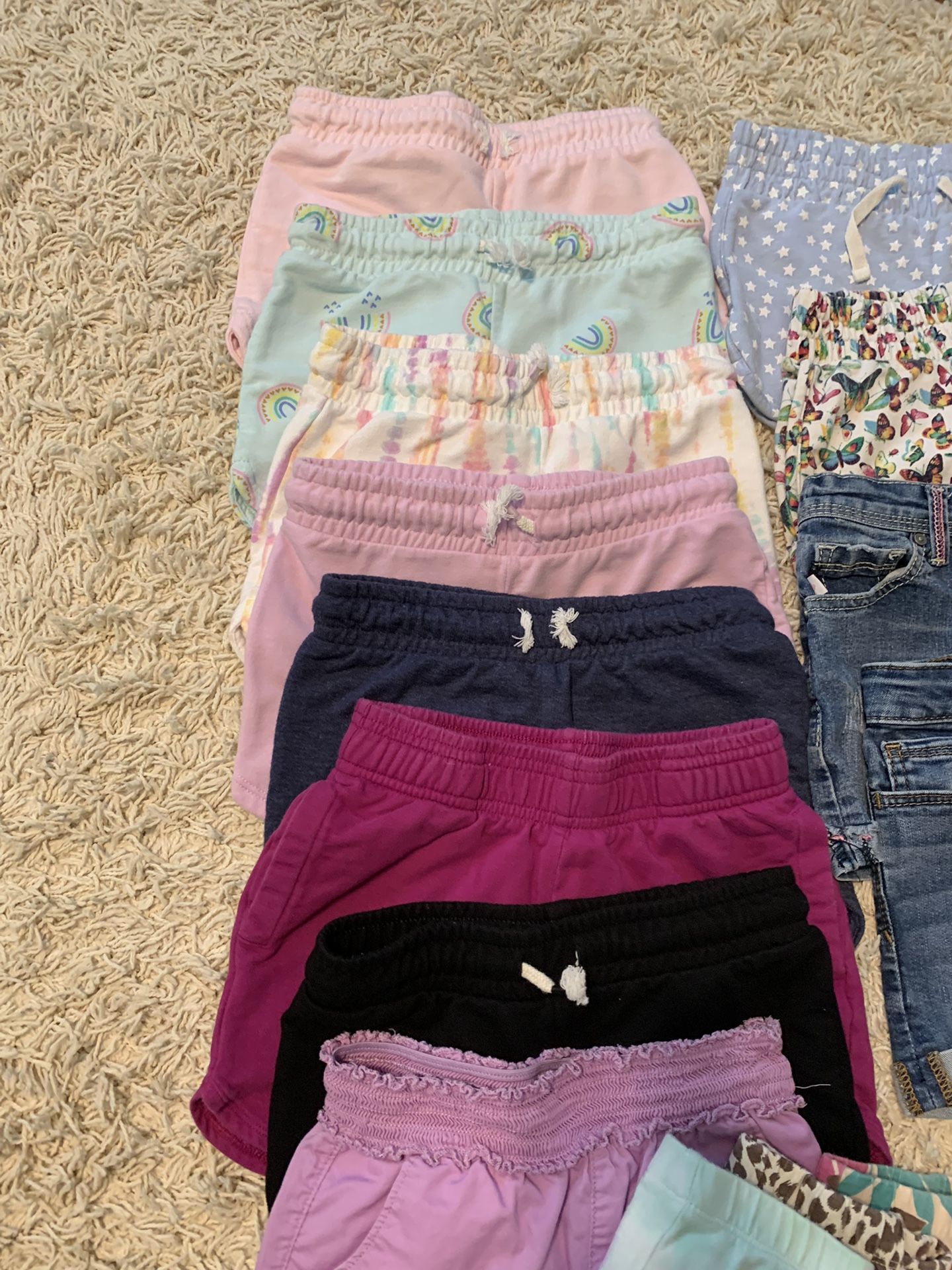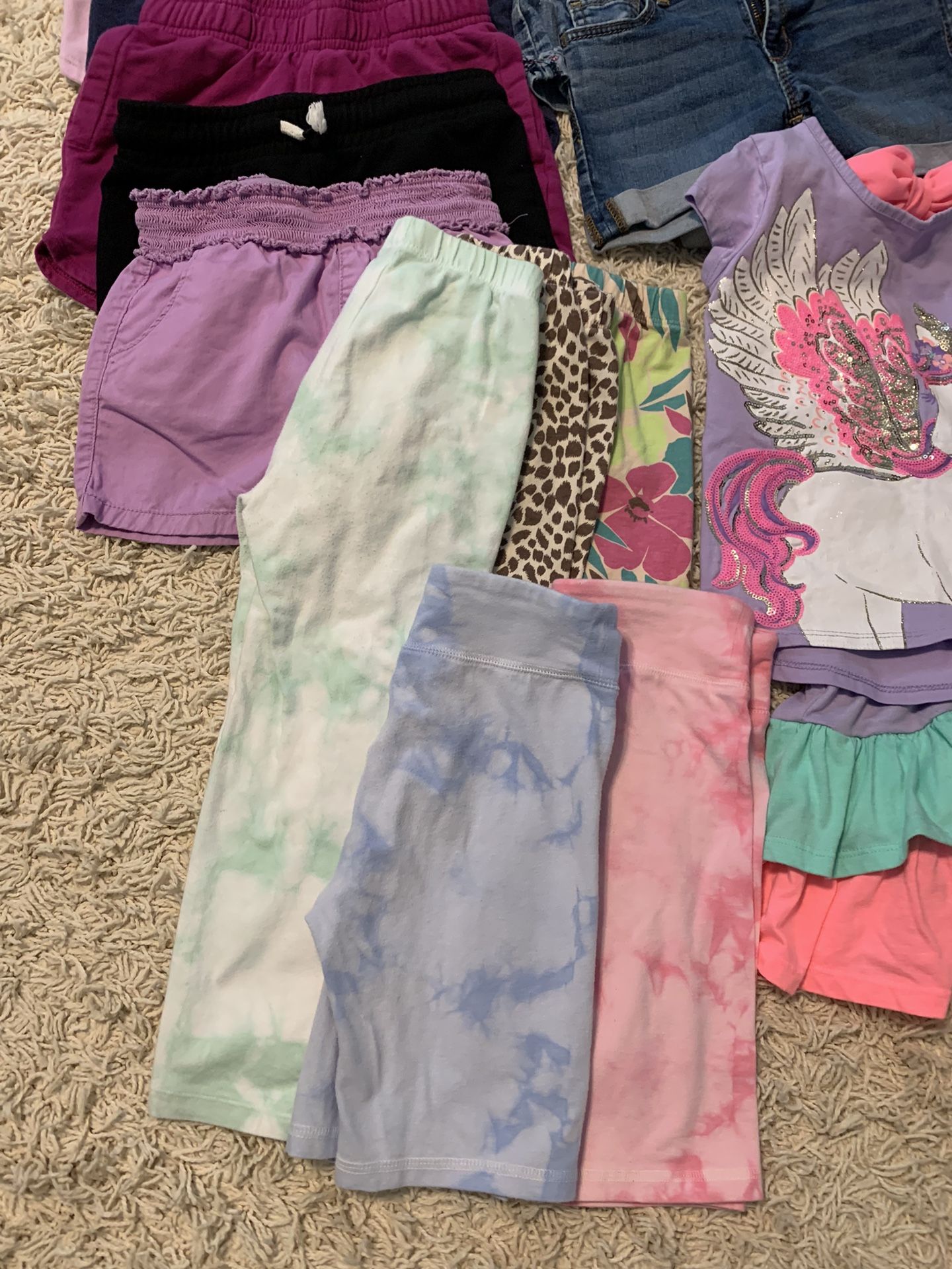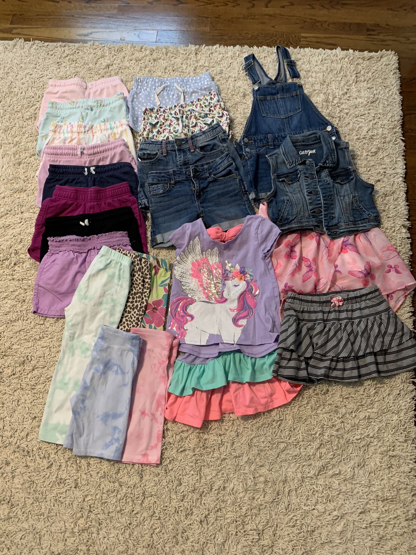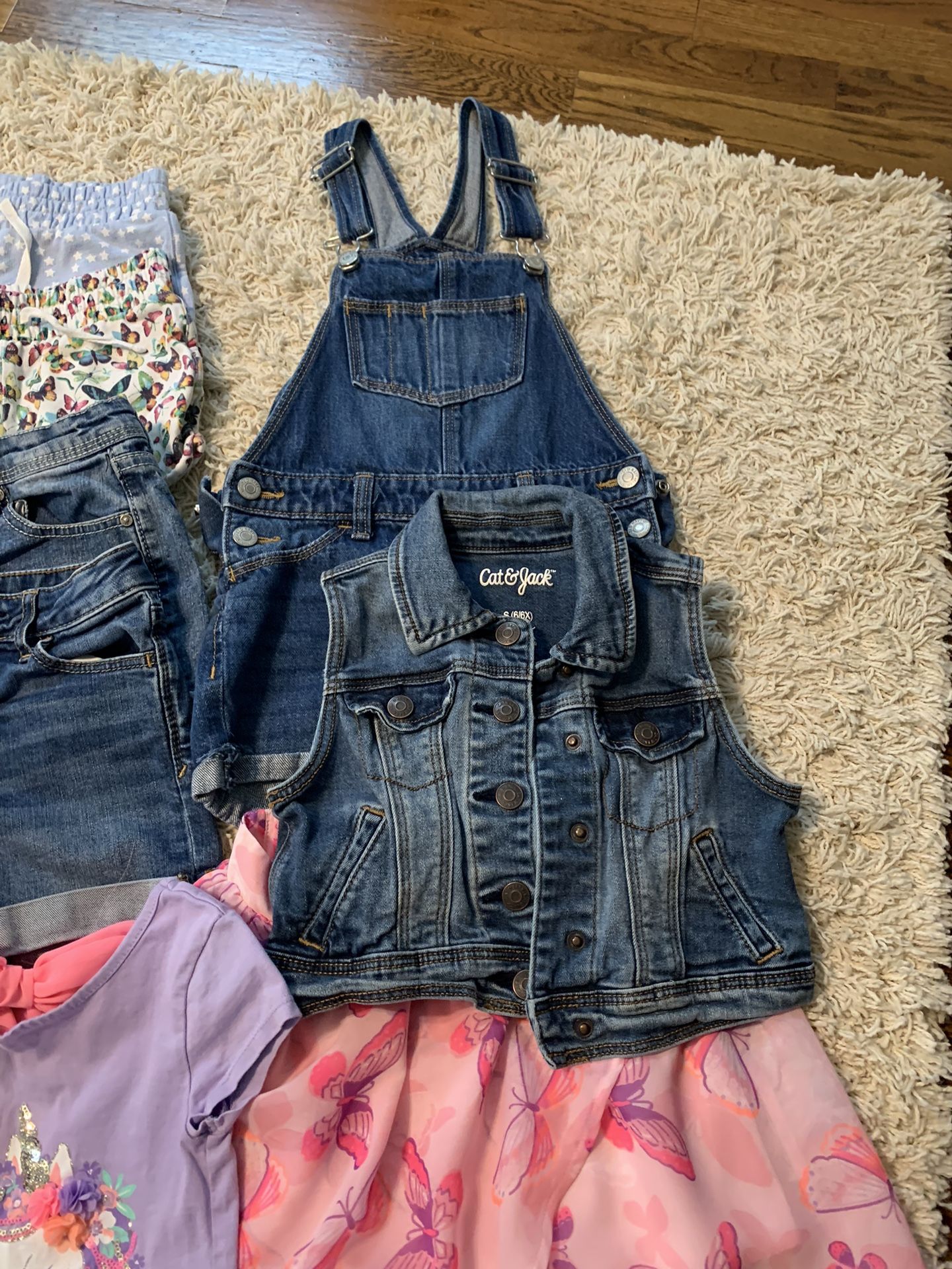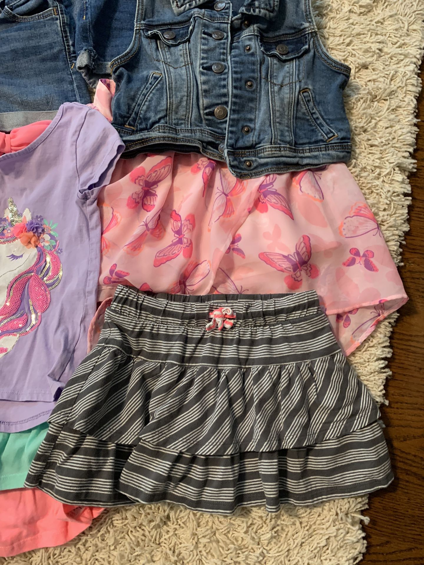 The white two piece bathing suit is from The GAP and the whole piece bathing suit is Disney Frozen. The unicorn two piece bathing suit and three piece set were purchased from Target. They show minor signs of wear but are in good, wearable condition nonetheless. They all come from a smoke free and pet free home.