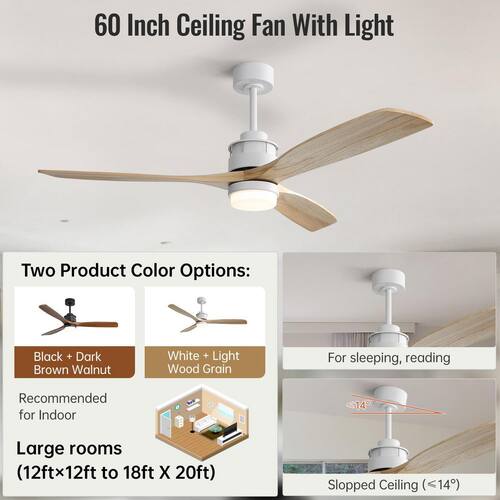 About This Product:Crafted with hand-sanded walnut blades and a matte black motor housing, this ETL-certified 60-inch ceiling fan delivers 6,500 CFM of powerful airflow at whisper-quiet operation (less than 30dB) while consuming 30% less energy than traditional AC motors. Its 6-speed reversible DC motor efficiently redistributes warm air during winter or cools rooms in summer. The integrated 18W LED (2,100 lumens) provides flicker-free dimming (5%-100%) and three color temperature options (3000K/4000K/6000K) to reduce eye strain.Control fan speeds, light brightness/dimming, 1/4/8-hour timers, and blade direction effortlessly via the included multi-function remote. Designed for versatile installation, it includes 5