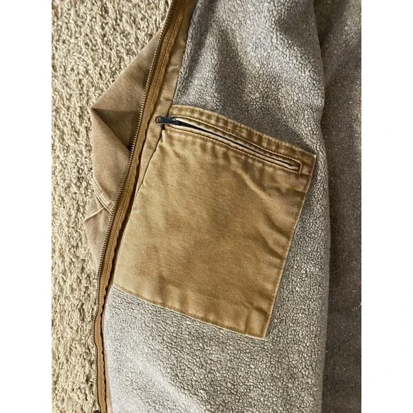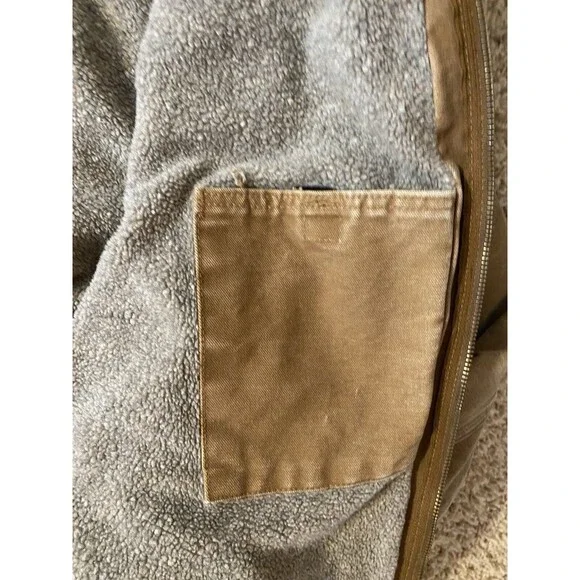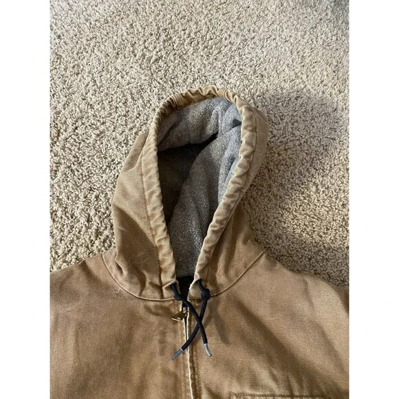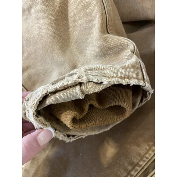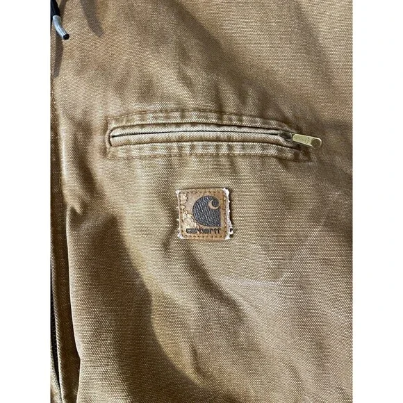 Embrace the classic durability with the Carhartt J141 Bomber Jacket in a versatile brown hue. Designed for those who appreciate practical workwear, this hooded jacket features a robust cotton duck canvas outer shell that stands up to demanding environments. The polyester insulation ensures warmth, while the Sherpa lining offers an extra layer of comfort during outdoor activities.This jacket comes in a size XL with a regular fit, suited for the men´s department, and it boasts a clean, solid pattern that complements its rugged style. The zip closure, accented by the iconic Carhartt logo and sturdy zipper detail, adds functionality and a touch of brand identity. Whether for work or casual outdoor pursuits, this bomber jacket merges timeless design with contemporary needs. Back side does hang a bit lower than the front. Rough measurements includedPlease see all photos for condition there is signs of wear and some staining. Rips in sleeves and other marks.