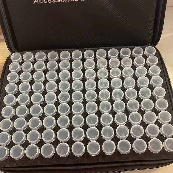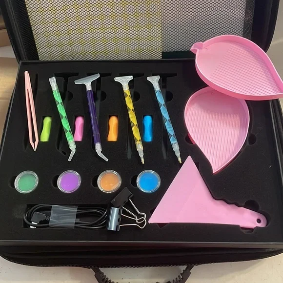 NIB Diamond Painting Kits Hard Case, 108 Storage Bottles, Tools, & Light Board1- Diamond Painting Storage Case 1- Diamond Painting light pad1- USB cable 108- containers (diamonds not included)4- Diamond Painting Pens4- Diamond paning pen case12- Diamond painting glue1- Diamond painting fix tool2- Diamond painting tray2- clips1- tweezer2- 64 sticker sheetsLight Pad Usage:Professional copy in animation, cartoon, tattoo tracing, diamond painting, craft projects, fabric design, photography slide transferring, professional tracing, in indoor architecture, design, and drawing