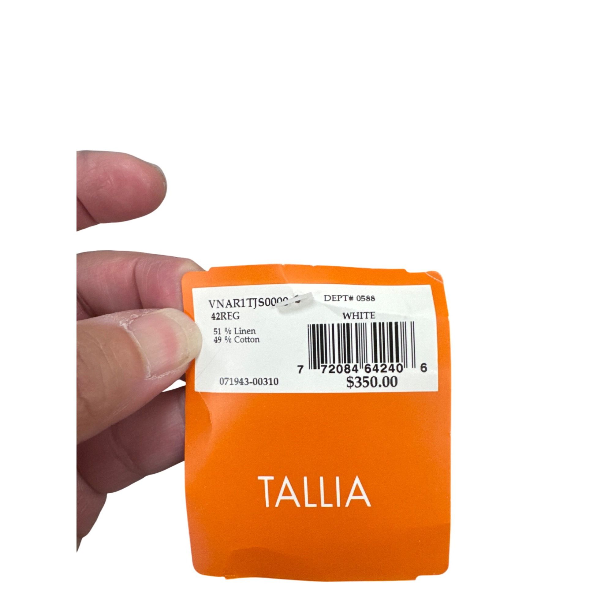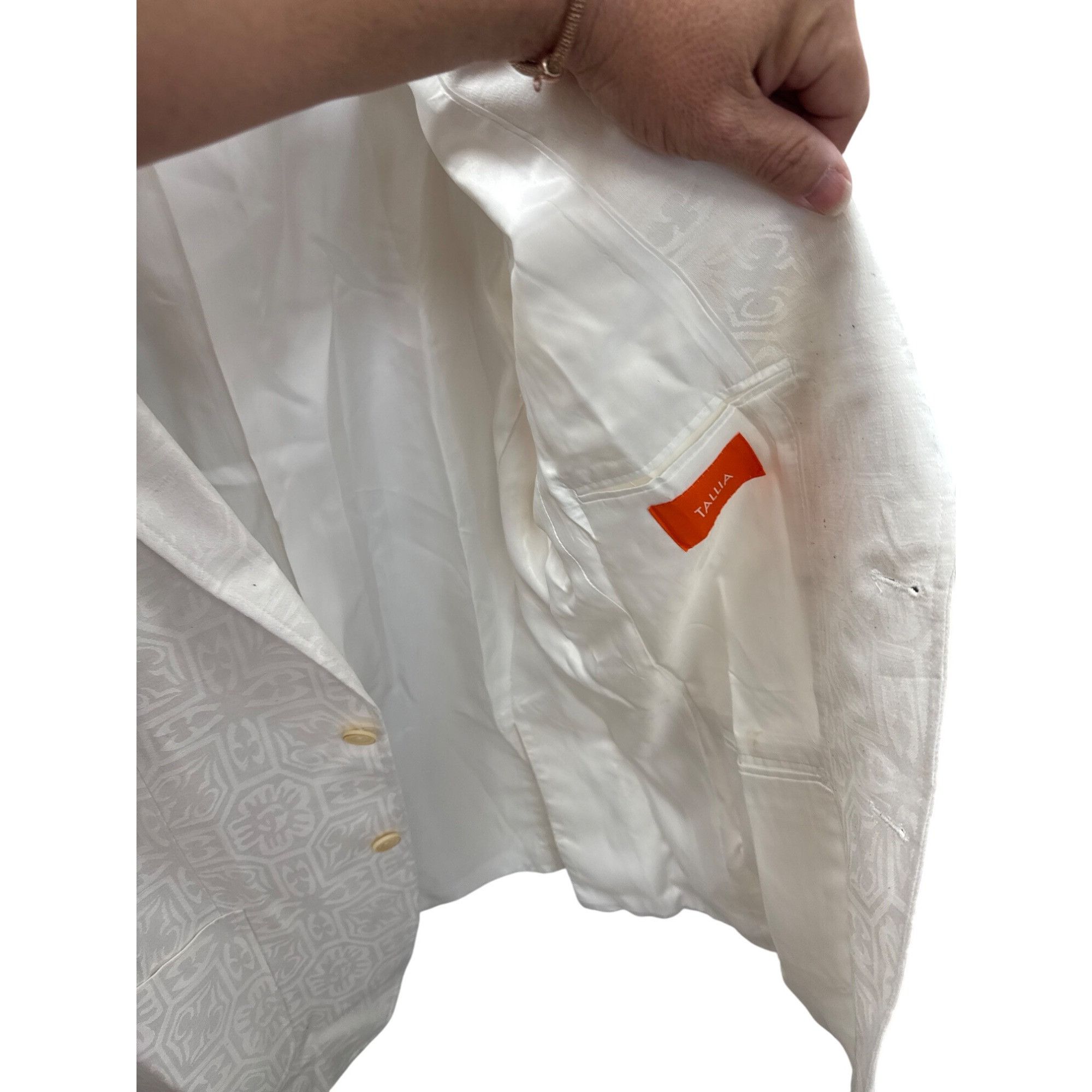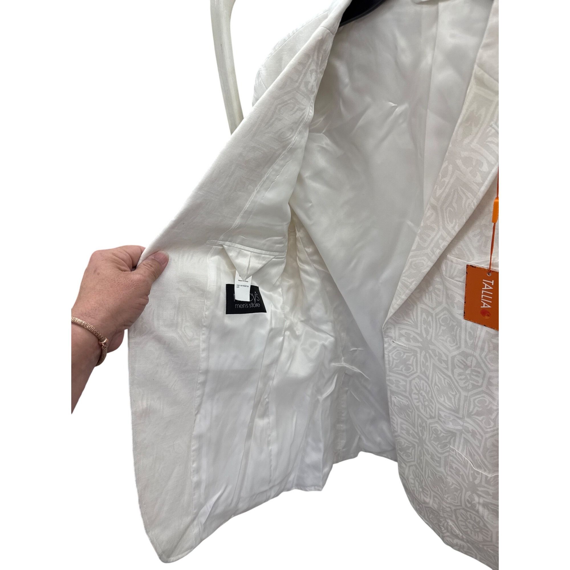 This sophisticated white mens blazer by Tallia offers a sharp and modern aesthetic. Its linen cotton blend ensures durability and breathability, ideal for elegant settings. It is unused new with tags and a beautiful wear. I ship fast. Shoulder to shoulder is 18", Chest is 19", Length is 30.5", Waist is 20". SKU8207