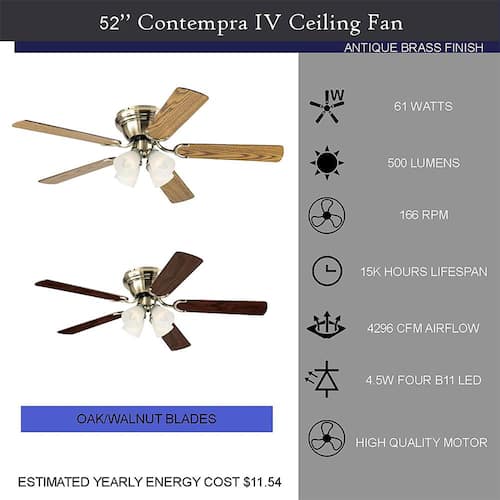 About This Product:Add a touch of grace and elegance to any indoor space with the 52 in. Contempora Brass ceiling fan. The 52 Contempora Brass features an integrated LED-light kit with opal frosted glass provides bright efficient illumination. This ceiling fan is designed for down-rod installation. With its high-quality motor that delivers powerful air movements and quiet performance, put in any room up to 100 sq. ft. to feel cool and comfortable.