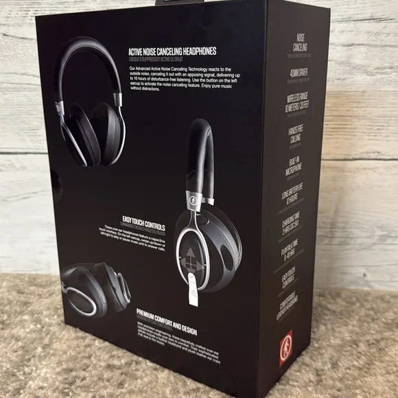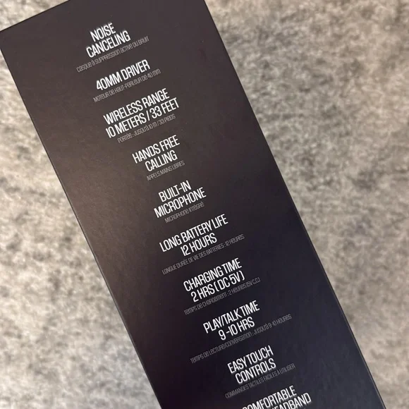 Experience superior sound quality with these sleek black wireless headphones. Perfect for music lovers on the go.Brand new in factory sealed box!-Noise Canceling -Wireless range 33ft-built in microphone -long battery life 12 hours-play/talk time 2hours-easy touch controls -comfortable leather headband