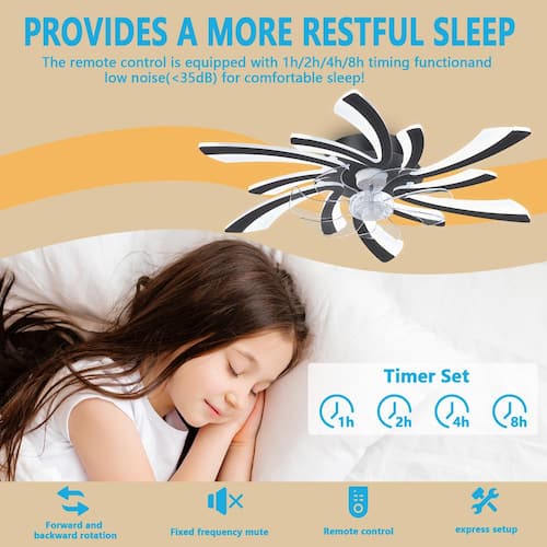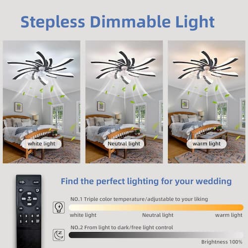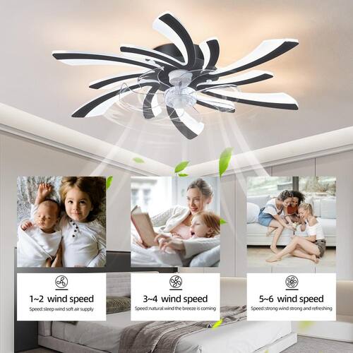 About This Product:The Quiet fan lamp transparent 7 blades, 6 gear powerful wind speed. New stainless steel material with white appearance can add a strong sense of design to your room while illuminating and blowing. Low profile ceiling fan has a reverse function , 6 wind speeds, 2-hours timing and all the functions can be operated by the hand-held remote or APP. The fan or illumination can be turned on separately, you can gradually adjust the color temperature (3000-6000K) of the ceiling light. The energy saving stepless dimmable light source can save more than 80% of energy. 30.7 in. Flush mount ceiling fan with DC reversible motor allows you to switch the air circulation mode from downward to upward in different seasons. Also this Bladeless ceiling fan has a silent fan blade, so you can use it while you sleep and is suitable for indoor spaces such as bedrooms, living rooms and dining rooms etc. After reading the manual, it can be easily installed. Most of the functional parts are already assembled. You only need simple installation, which can be completed in about twenty minutes.