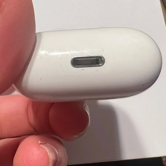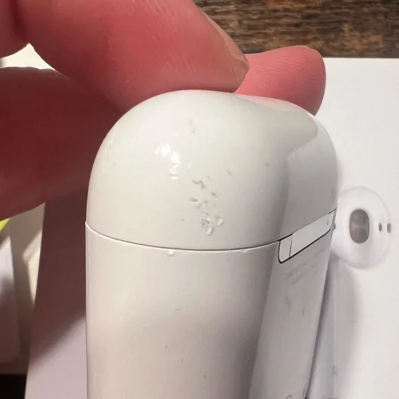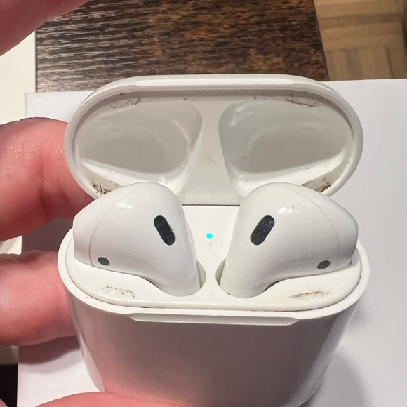Apple AirPod earbud headphones with Apple charging case. Second generation. Bought new. Wear shown in photos. They work well, but one side is a little louder than the other. Easy to adjust the L/R balance in settings which is what I did! Charging case works perfectly to charge, plug-in works, headphones hold charge evenly.