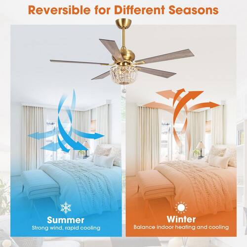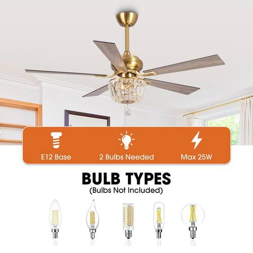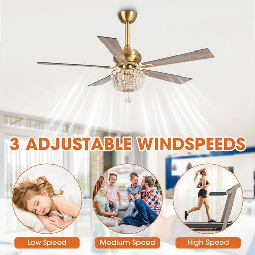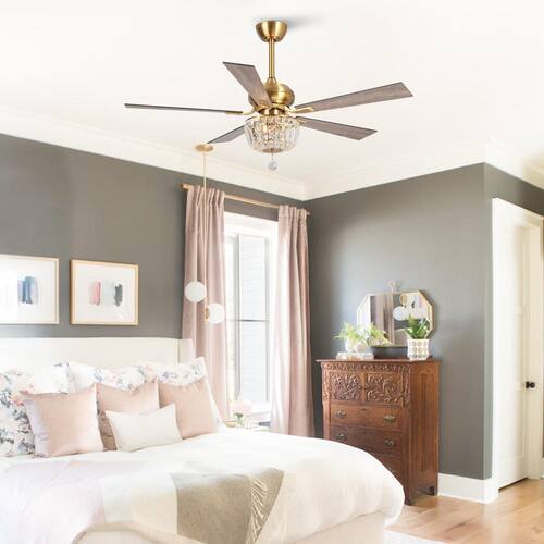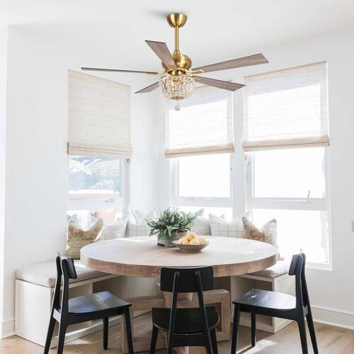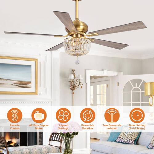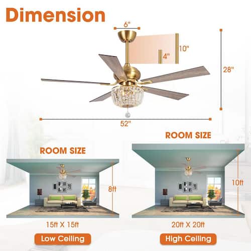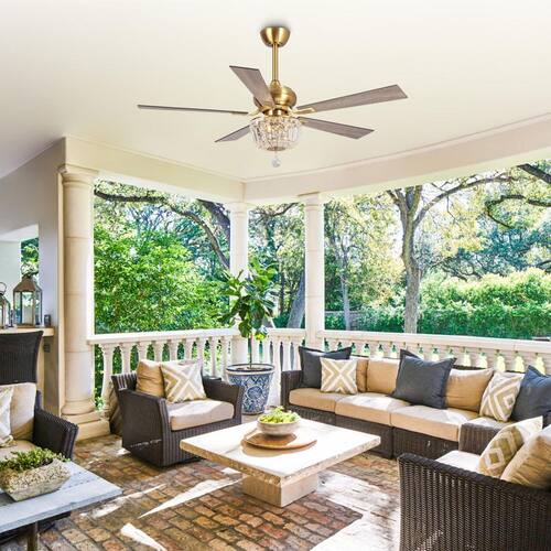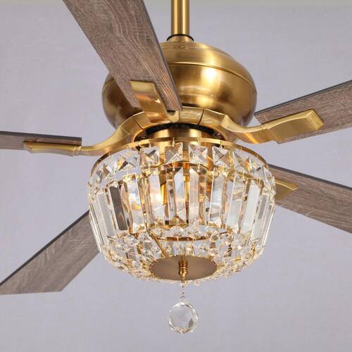 About This Product:This 52 in. crystal chandelier ceiling fan features a classic brass gold finish motor and five weathered oak finish wood blades that offer a touch of class to the indoor ceiling fan. The sparkling shade is made of glass crystal prisms and faceted rectangular accents, which throws the light around in a spectacular manner. Control the ceiling fan with the included 3-speed hand-held remote control, perfect for ease of use.