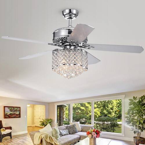 About This Product:Bask in the cooling breeze from this ceiling fan. Equipped with a dazzling crystal chandelier, this fan features 5 reversible blades and a reversible motor. A lustrous chrome finish gives this fan a sleek, contemporary look, while the chandelier´s crystal embellishments create a sparkling play of light.