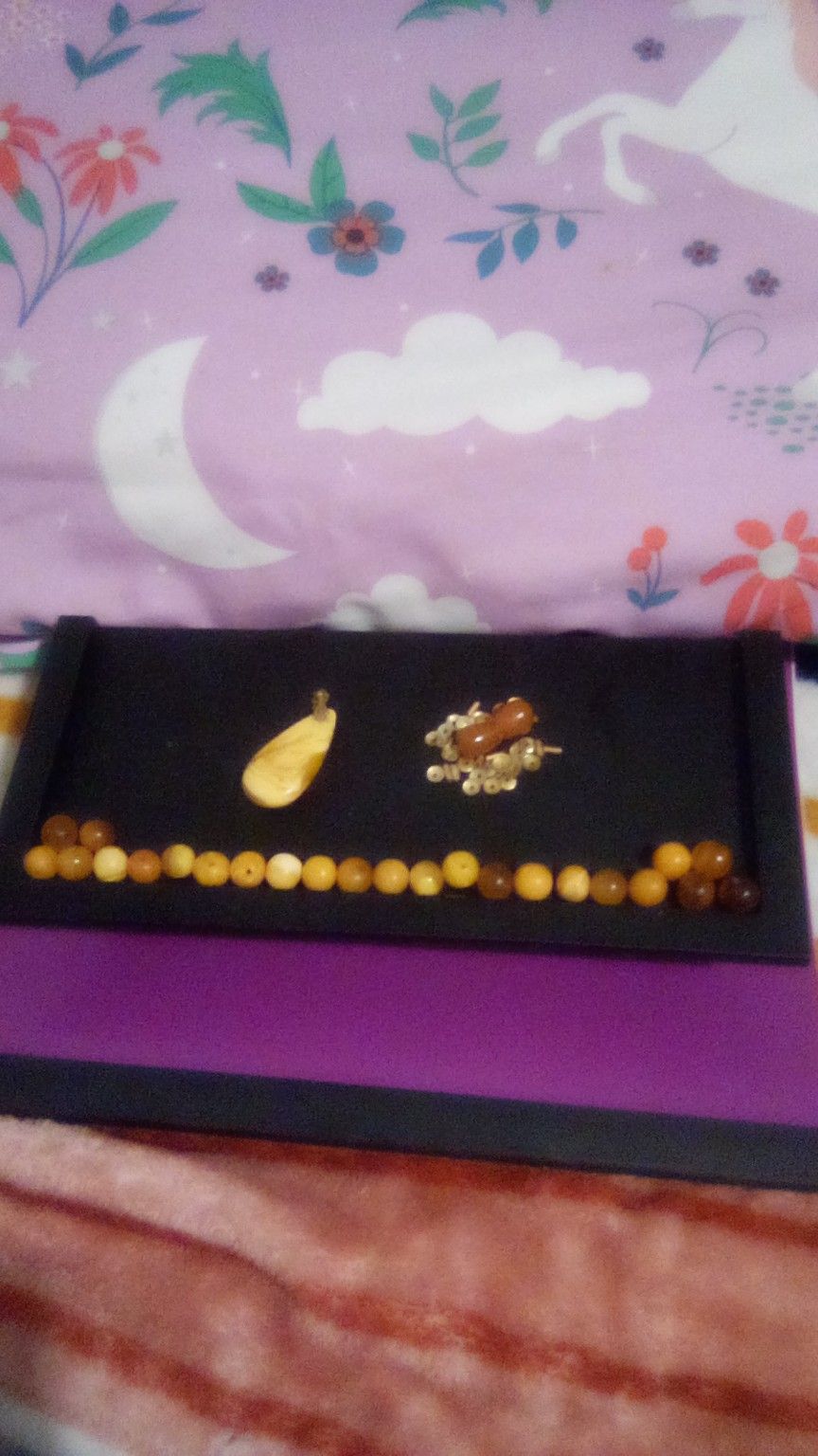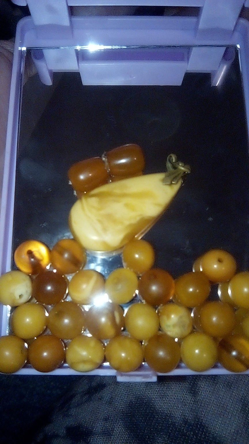 This large Amber is Butterscotch Baltic EggYolk and there are 26 round amber beads all different colors. My great Aunt got this in Russia. She picked out the Amber and the jeweler made it for her. I apologize the necklace is broken, but instead of buying the chain I lost,bive decided to sell.
