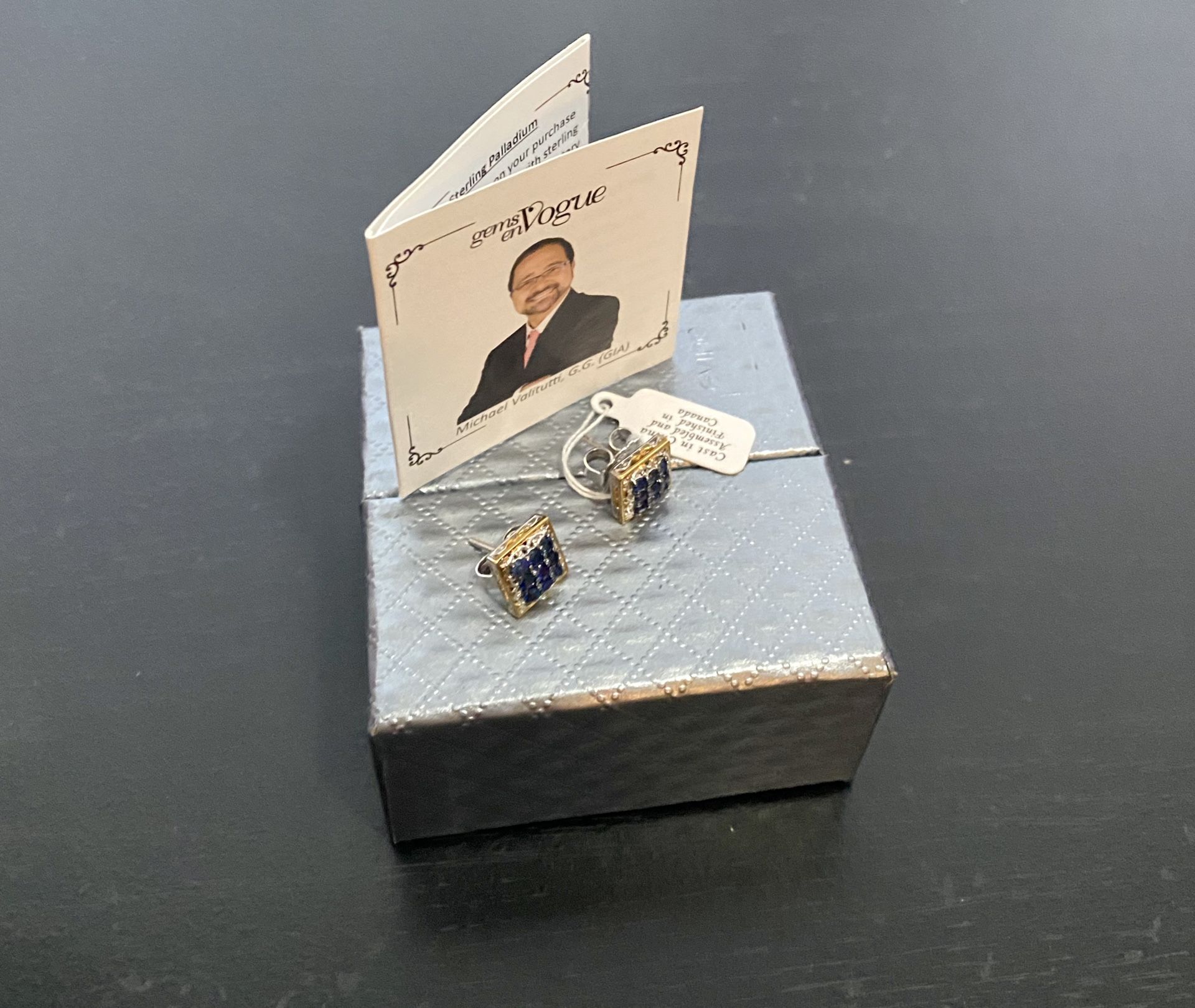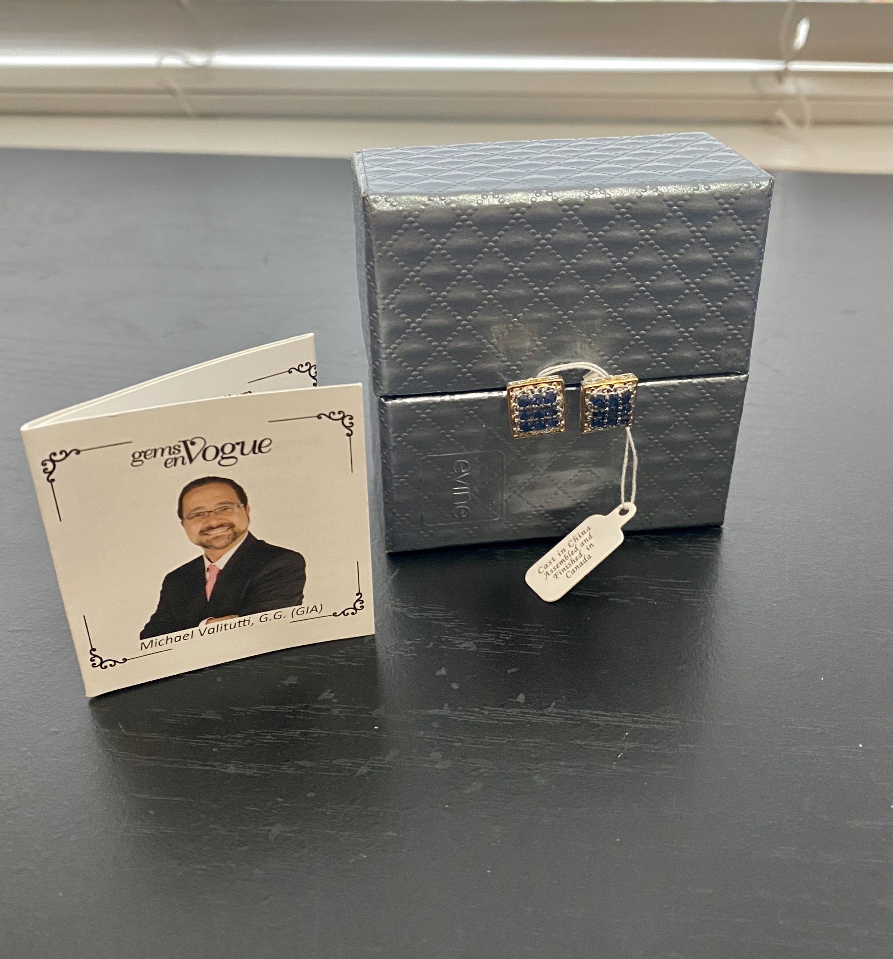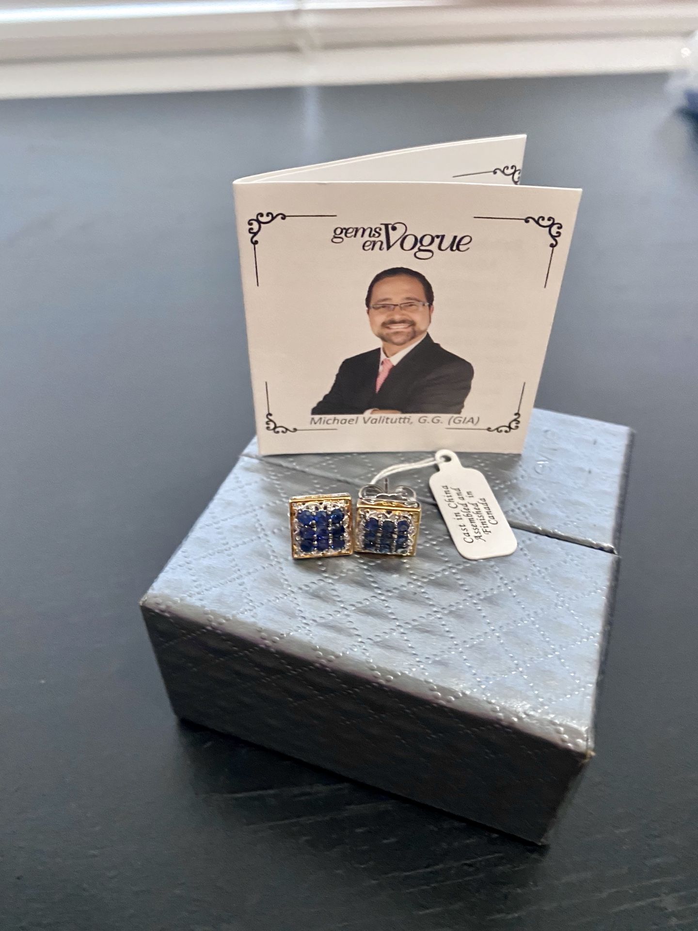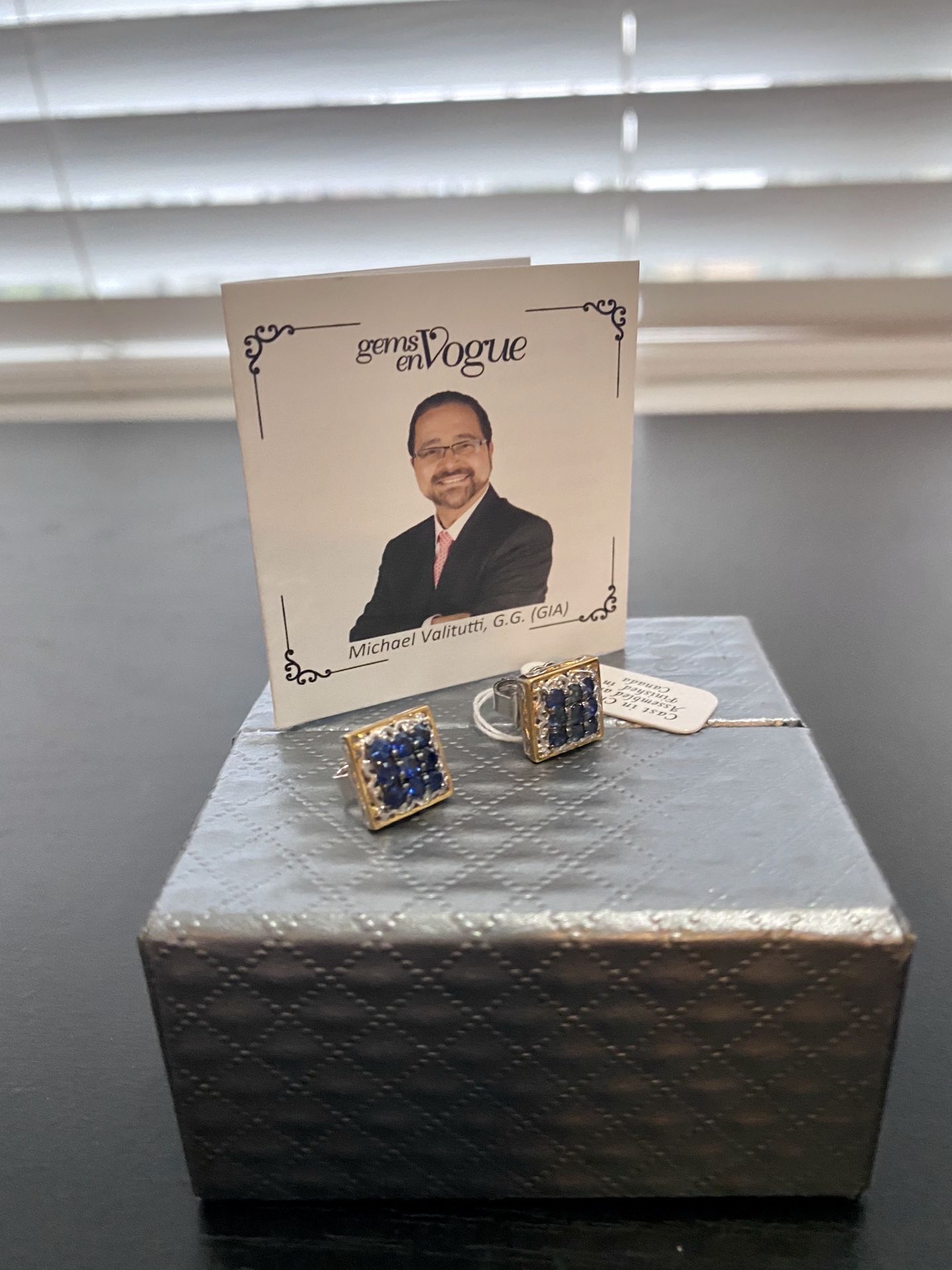 BRAND NEW W/ TAGS — ORIGINALLY $278.50DescriptionMake these bole, blue studs a staple in your jewelry collection fit for a queen! Each two-tone scrollwork detailed earring in this pair features a square cluster design covered with stunning royal blue sapphires. Butterfly backings allow for easy, no-fuss fastening so you can get to looking fabulous in no time!Earring DetailsMetal: 18K gold embraced™ sterling silver and palladiumStone Information: 18 round modified-brilliant cut 2.25mm royal blue sapphiresSetting Type: ProngApproximate Total Weight: 1.09ctwMeasurements: 3/8"L x 3/8"W x 3/16"HBacking: ButterflyCollection: Gems en Vogue
