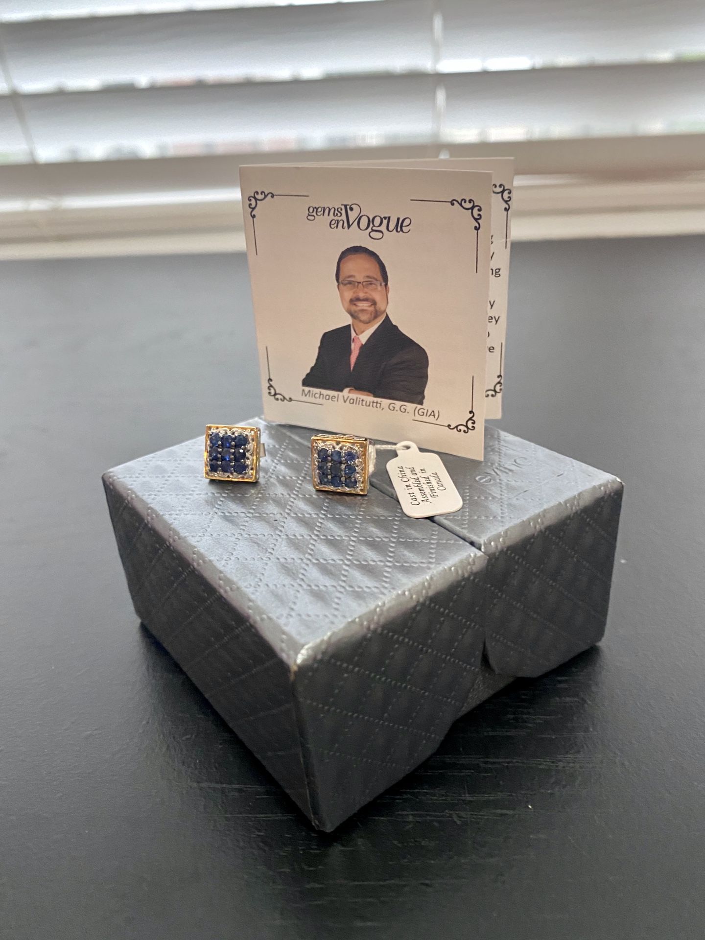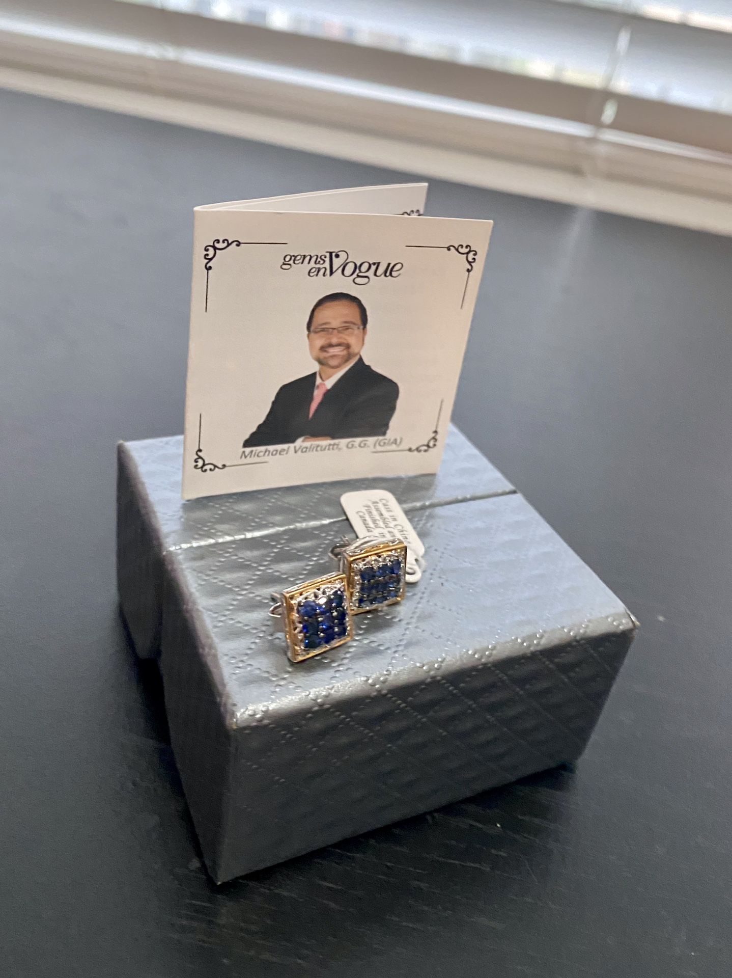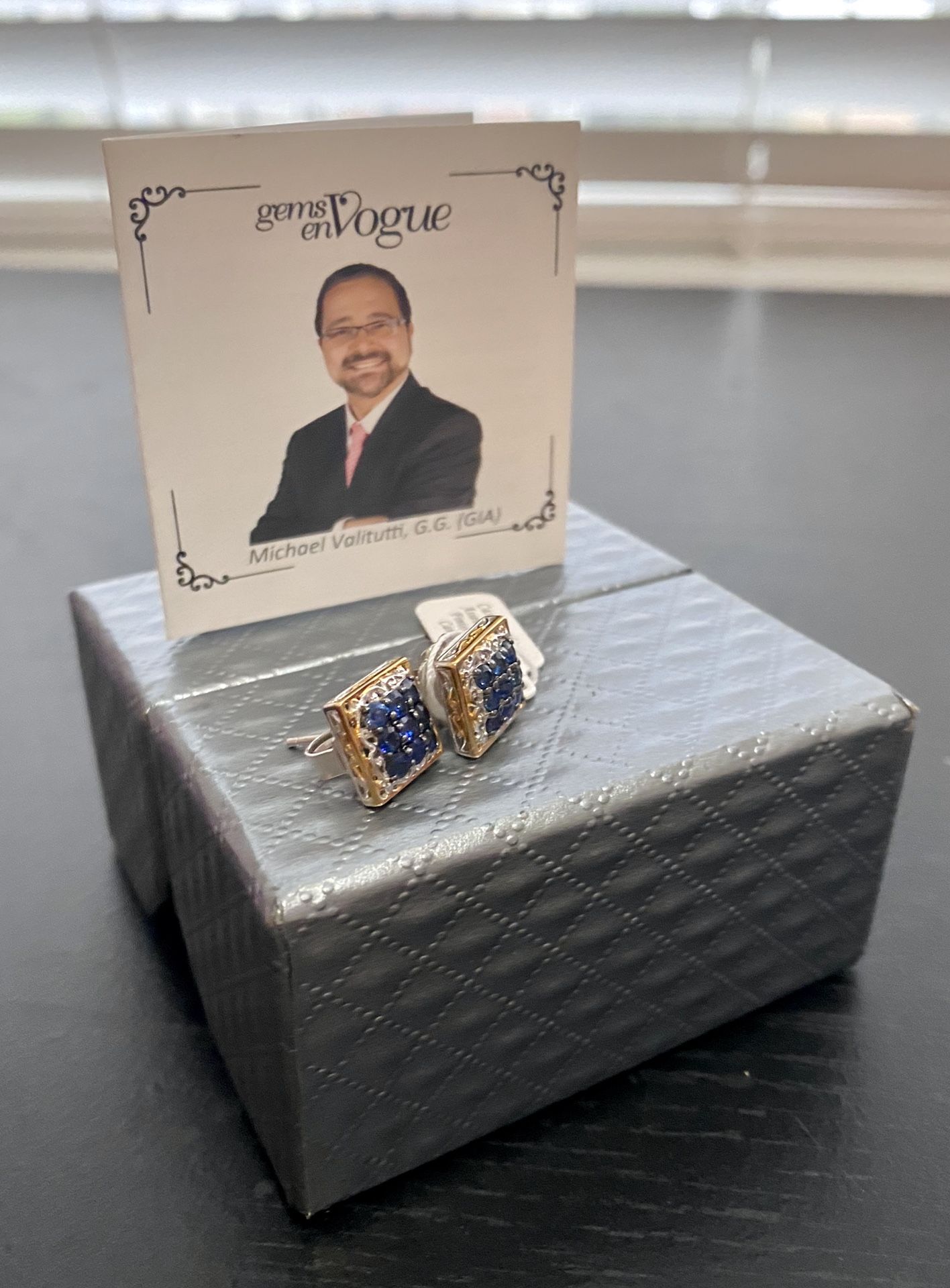 BRAND NEW W/ TAGS — ORIGINALLY $278.50DescriptionMake these bole, blue studs a staple in your jewelry collection fit for a queen! Each two-tone scrollwork detailed earring in this pair features a square cluster design covered with stunning royal blue sapphires. Butterfly backings allow for easy, no-fuss fastening so you can get to looking fabulous in no time!Earring DetailsMetal: 18K gold embraced™ sterling silver and palladiumStone Information: 18 round modified-brilliant cut 2.25mm royal blue sapphiresSetting Type: ProngApproximate Total Weight: 1.09ctwMeasurements: 3/8"L x 3/8"W x 3/16"HBacking: ButterflyCollection: Gems en Vogue