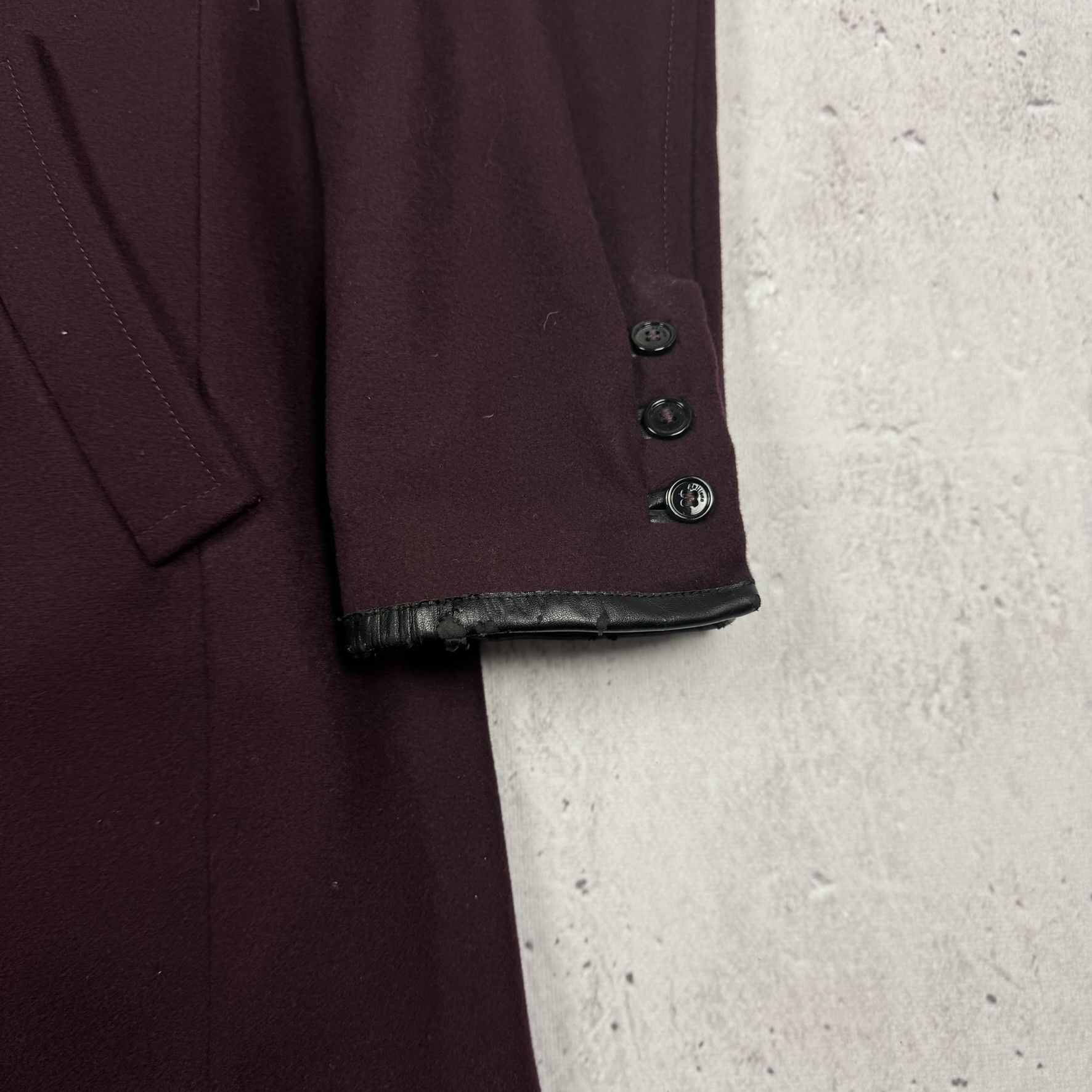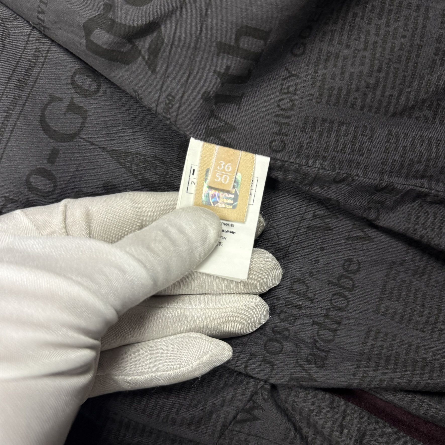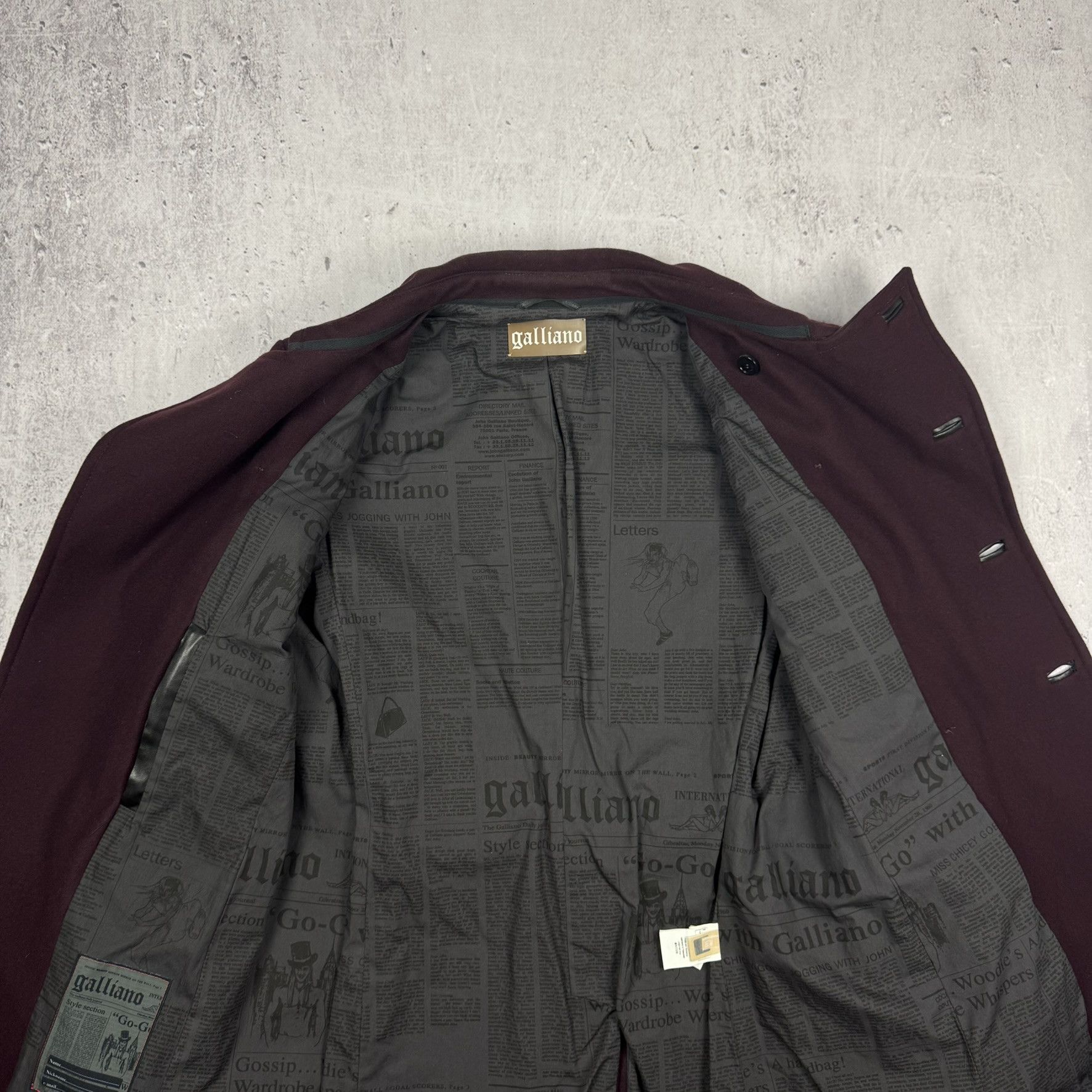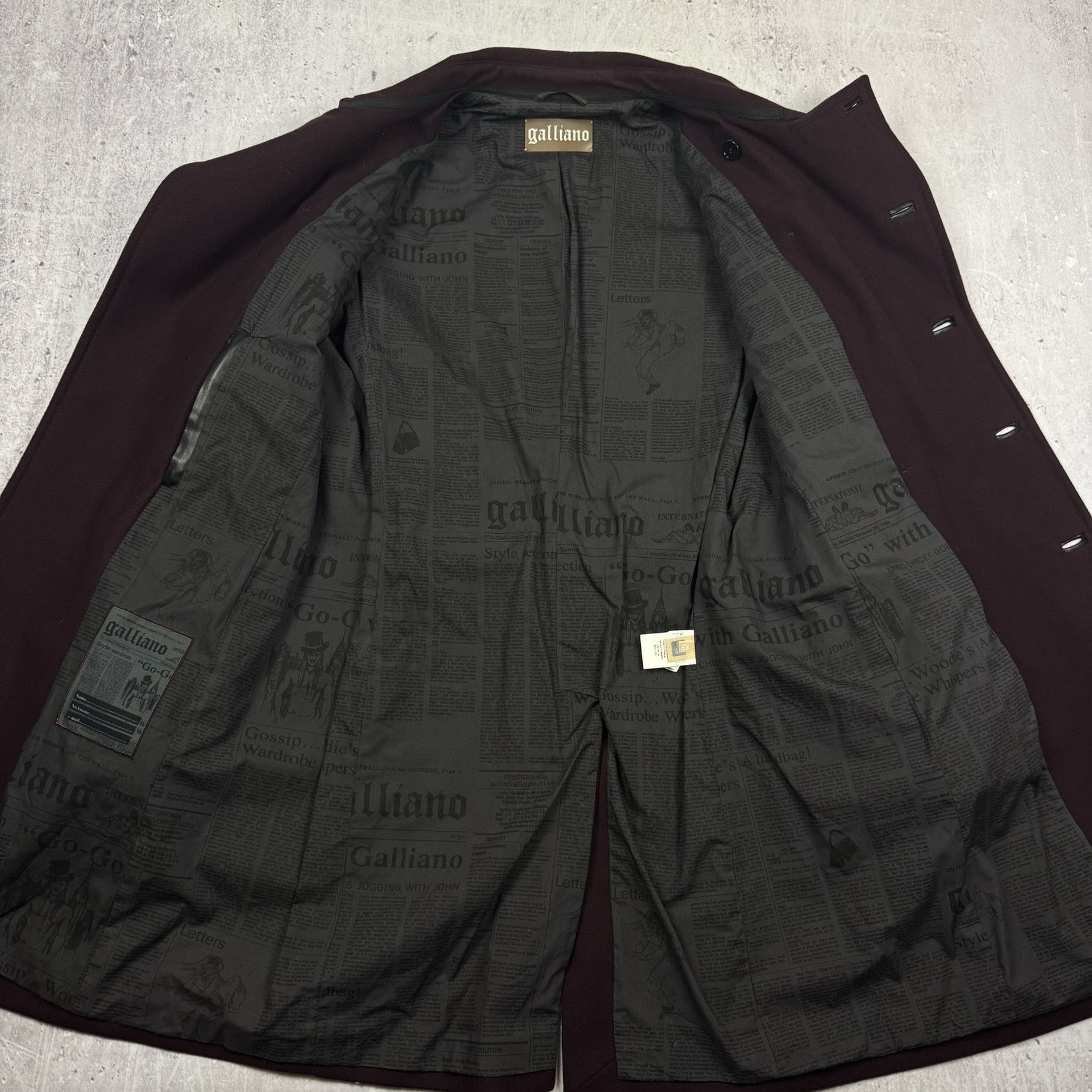 A unique coat by John Galliano in a deep burgundy color. Made of high quality wool, it stands out with its characteristic Newspaper pattern and luxurious design. Ideal for people who value originality and prestige in fashion.