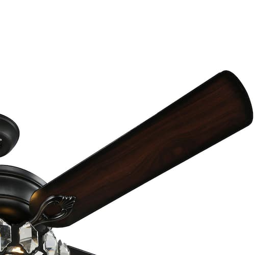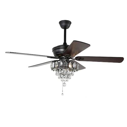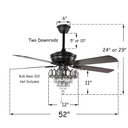 About This Product:This indoor crystal ceiling fan brings a trendy look to your living space. The new black/chrome finish and clear glass around the light kit combine perfectly to bring you a beautiful and shiny look. Blades are reversible, choose from the man craft wooden material for even more flexibility. This fan is operated with an included remote control for added convenience. The 3 E12 bulbs (Not included) provides energy saving, low maintenance, and long-lasting performance. Exterior damp rated, ideal for interior and exterior spaces such as Entryways, family rooms, or covered outdoor porches.