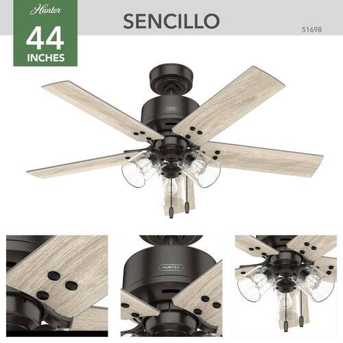 About This Product:Industrial meets farmhouse chic with the Sencillo ceiling fan perfectly sized to cool your home´s smaller spaces. Ideal for a home office, hobby room, guest bedroom, or entryway, the Sencillo is outfitted with Hunter´s SureSpeed Guarantee so air flows freely while the fan remains wobble-free. Multiple finishes and an LED light trio make this ceiling fan a gorgeous addition to any space.