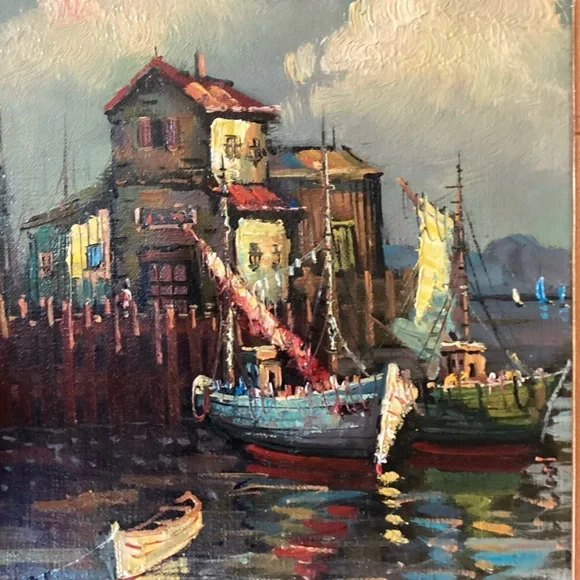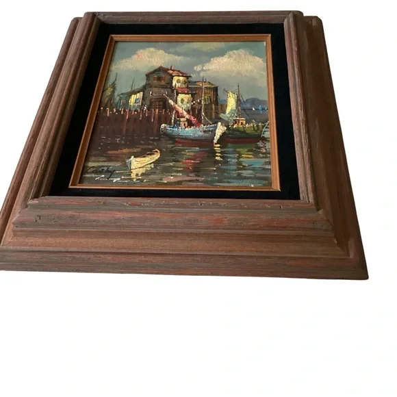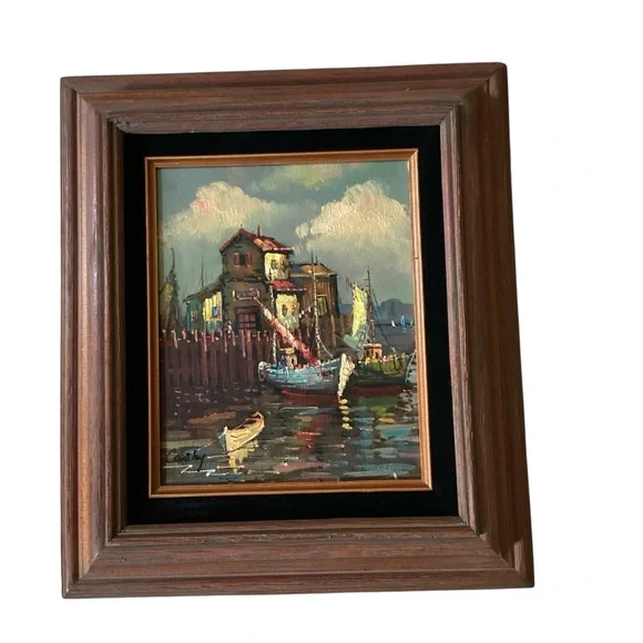 Pretty framed oil painting features boats in a harbor in cloudy weather. Done in jewel tones, signed simply “Cathy”, it is matted in gold and black and framed in a bevelled wood frame. Measure 16” X 14”. Very good vintage condition.