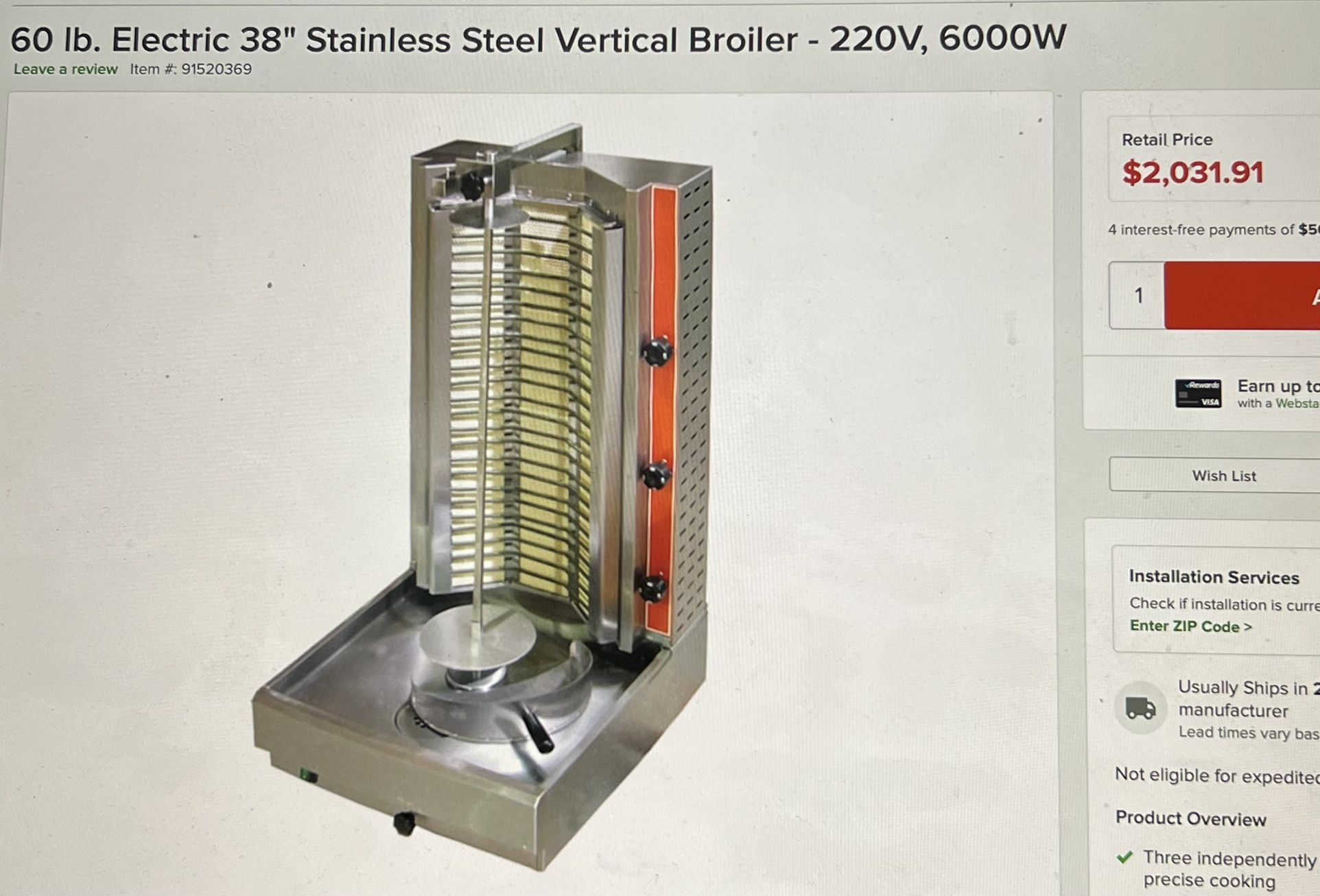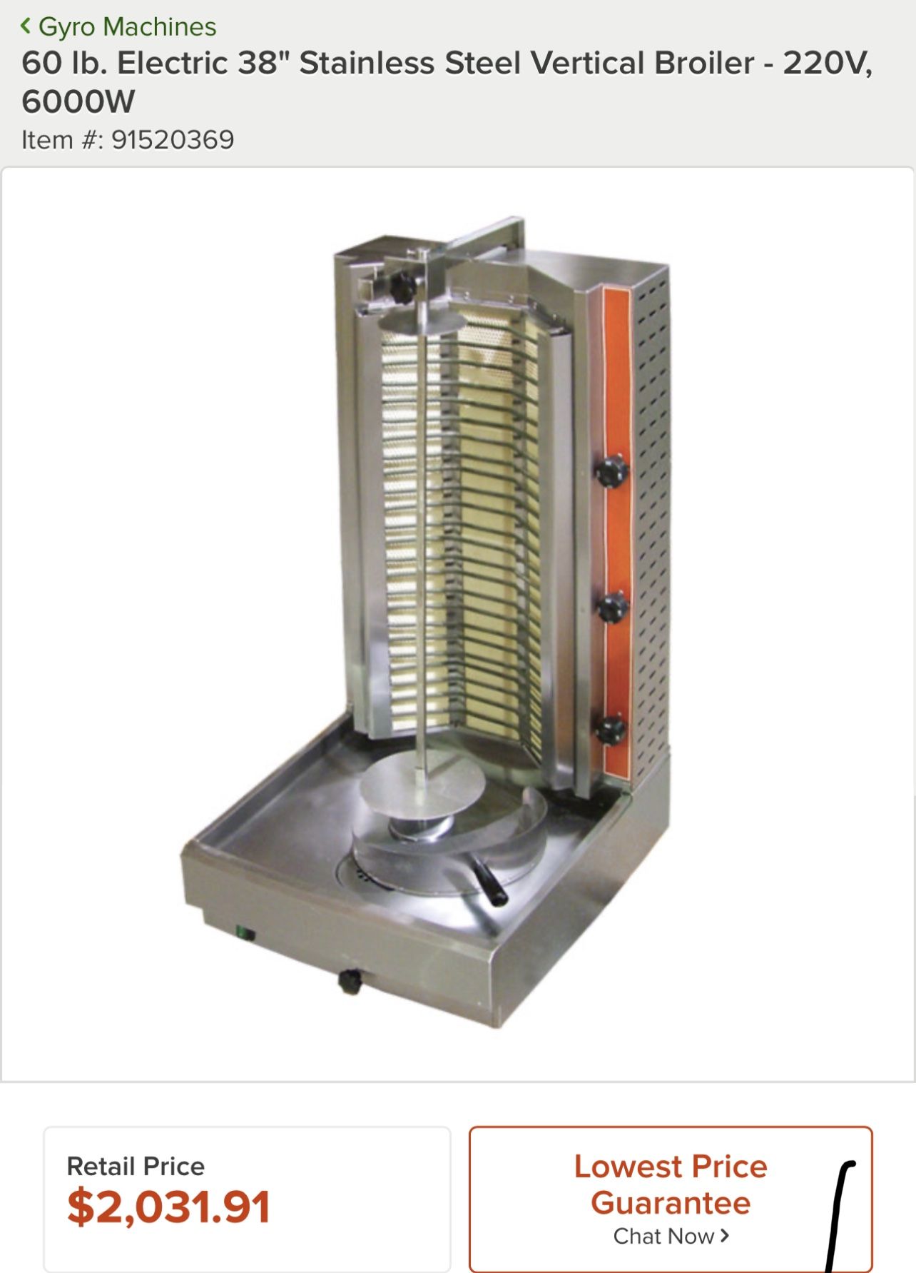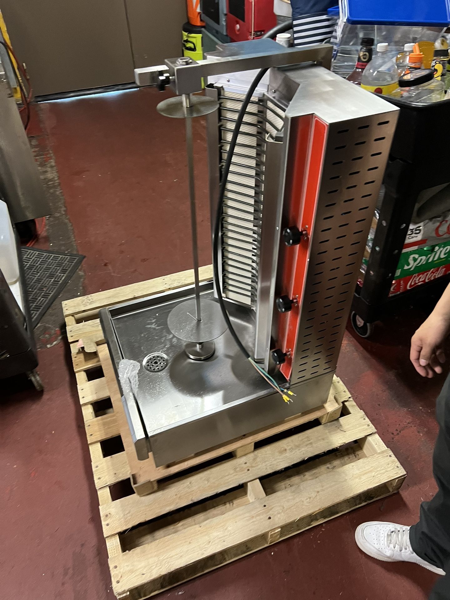 New never used. Only unboxed and saw it wasn’t a match for my restaurant. Still in its original pallet. DetailsPerfect for gyros, shawarmas, tacos al pastor, and doner kebabs, this vertical electric broiler is a great addition to any restaurant that serves lamb, goat, chicken, turkey, or beef! This vertical broiler uses three independently controlled heating elements to evenly warm up to 60 lb. of meat, keeping the inside juicy and tender while the outside gently crisps. To give you total control over cooking, this broiler boasts a unique adjustable angle spit that also allows for easy carving of your most popular meats. A stainless steel construction ensures that this unit will last in even the highest demanding kitchens, and is also simple to disassemble and clean after use. Whether you´re looking to make delectable kebobs, tacos al pastor, or your signature gyros, this vertical broiler will help you ensure that your meats are cooked to perfection thanks to the 122 to 572 degrees Fahrenheit temperature range. This unit requires a 220V electrical connection for operation, and has a 6000W output.Overall Dimensions: Width: 21" Depth: 24" Height: 38 3/4"Cooking Area Dimensions: Diameter: 7 1/2" Height: 27 1/4"