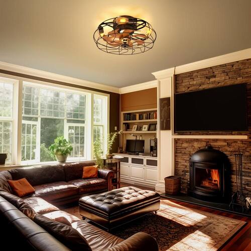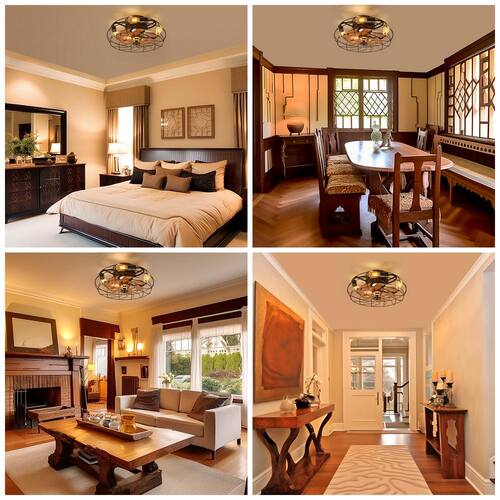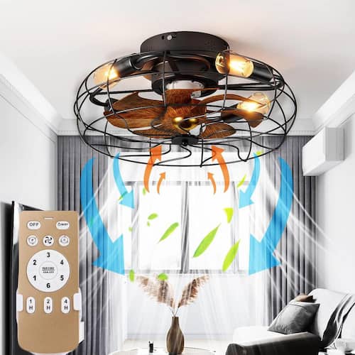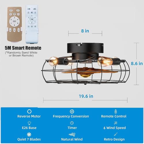 About This Product:This 19.6-inch matte black industrial style reversible seven leaf ceiling fan features an open cage design with a remote control. The body is made of metal and comes with a wood grain blade (actually plastic material), which has a rural style. It also has a reversible motor that can cool your room in hot months and maintain warm air circulation in winter. This fan is compatible with a dimmer switch and has 6 different wind speeds. In addition, the fan can be compatible with four E26 bulbs.Note: Bulbs are not included.