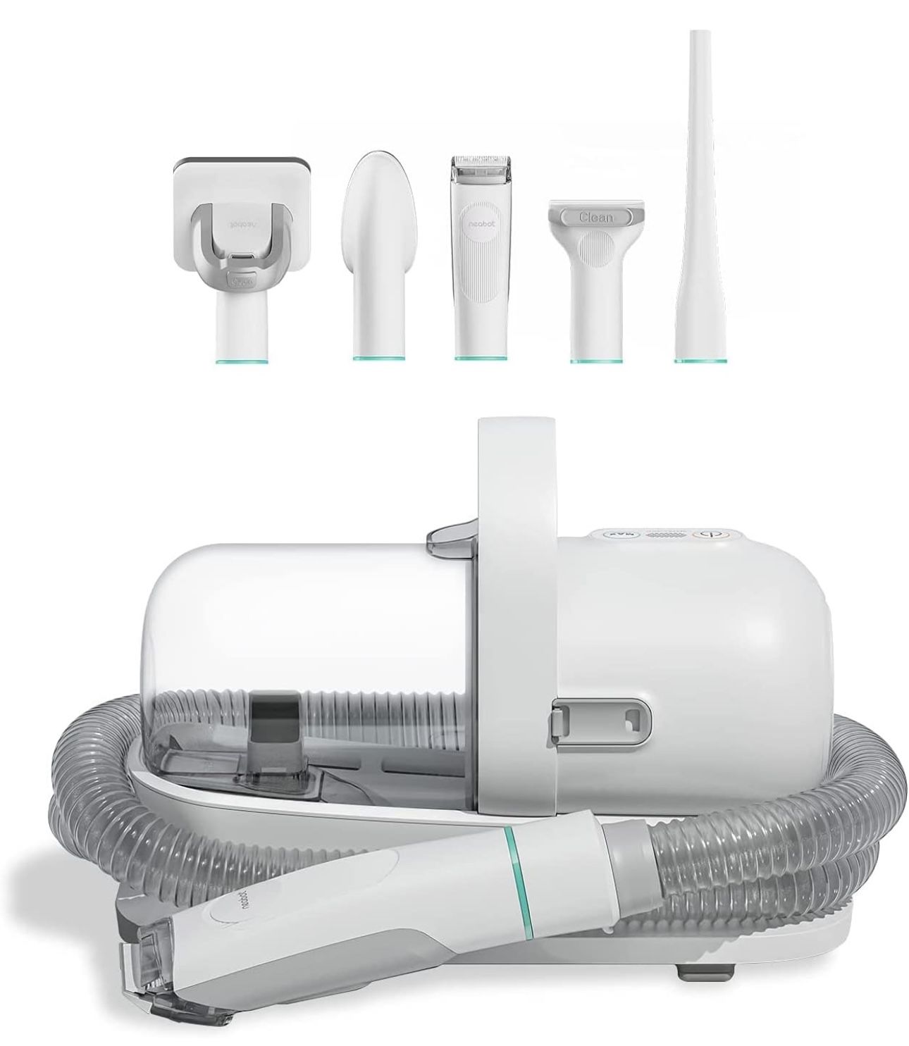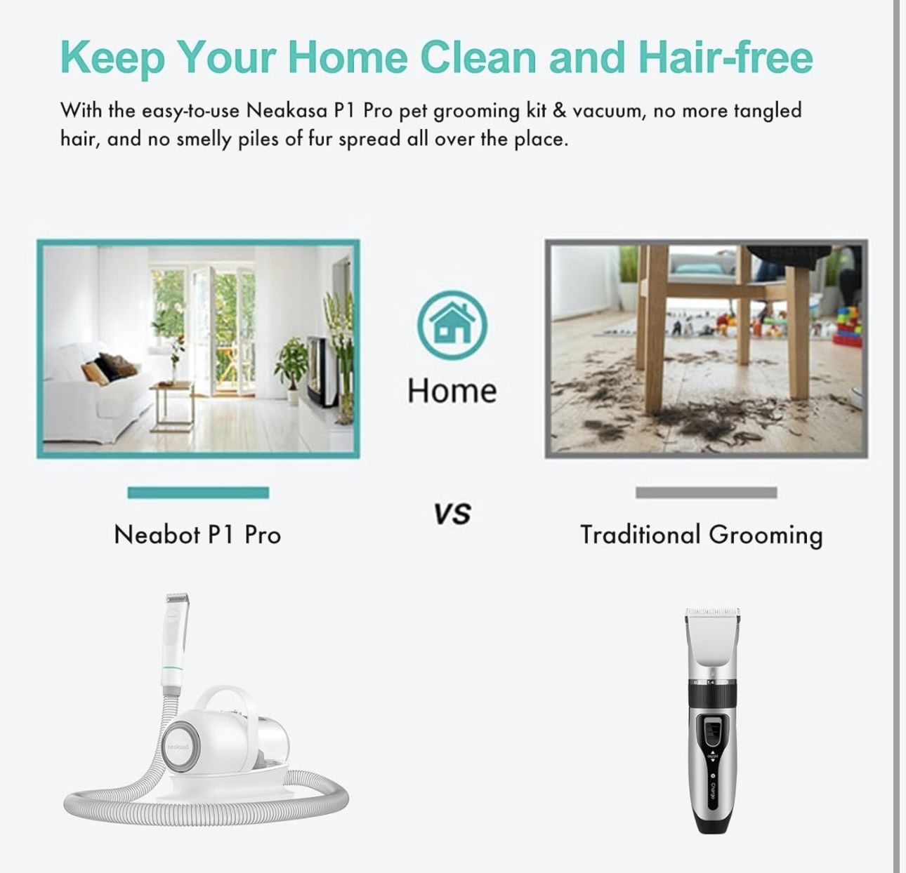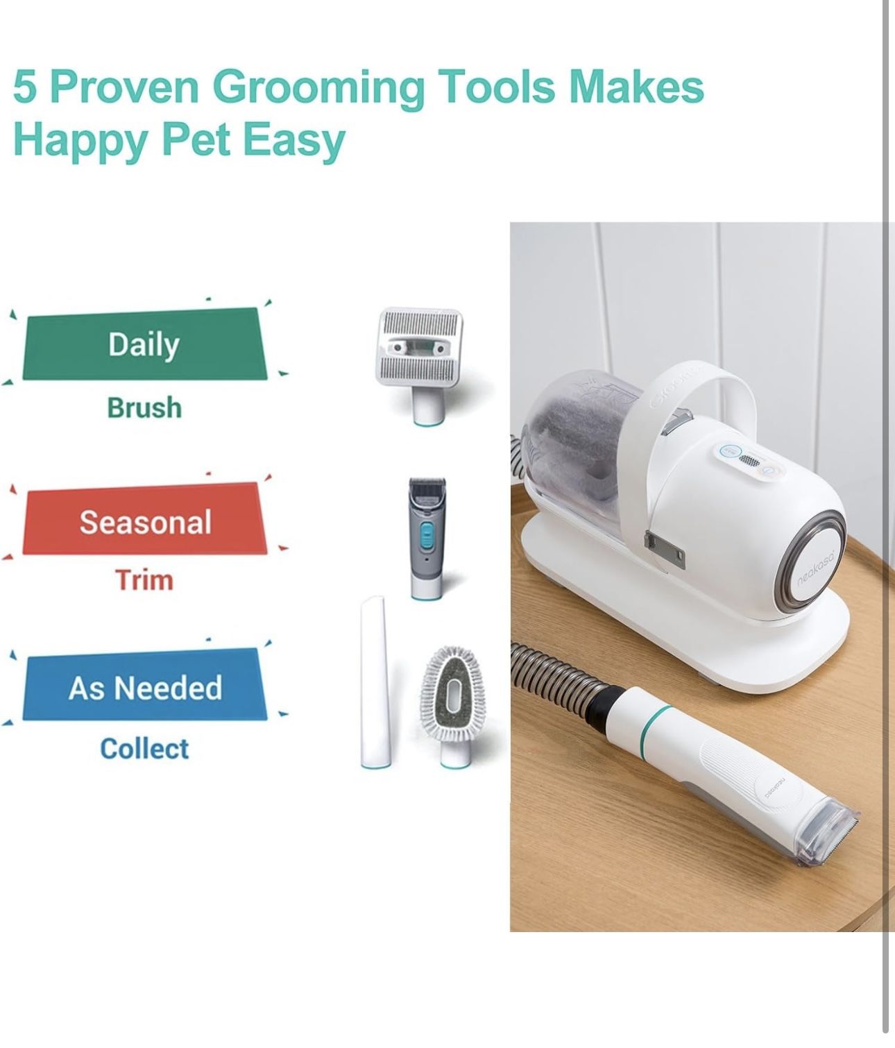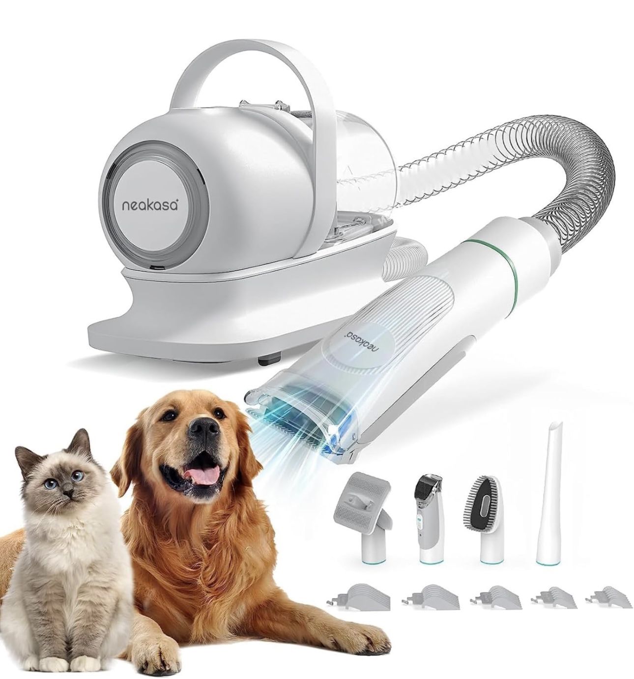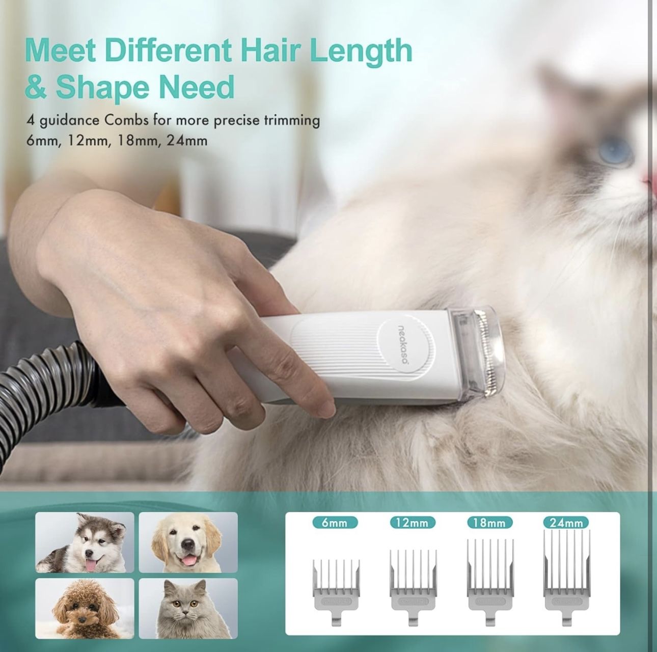 Brand new All-in-one Professional Grooming】This pet grooming clippers come with 5 proven tools: Grooming brush and Rake brush to help prevent damaging the topcoat whilst promoting a soft, smooth, healthier skin & coat for your pet; Electric clipper provides excellent cutting performance; Nozzle head and Cleaning brush can be used for collecting pet hair falling on the carpet, sofa and floor.【Vaccumable Pet Grooming Kit】: Traditional home grooming tools bring about a lot of mess and hair in the home. But our P1 Pro grooming kit with vacuum function collects 99% of pet hair into a vacuum container while trimming and brushing hair, which can keep your home clean, and there’s no more tangled hair and no more piles of fur spreading all over the house.【5 Comfortable Guard Comb】Adjustable trimming combs (3mm/6mm/12mm/18mm/24mm) suitable for trimming hair of different lengths. The detachable guide comb allows for quick and easy changing, enhancing versatility.【Low Noise Design】: Pet clippers for dogs with low noise design to help the pet feel at ease and no longer afraid of haircut. We suggest grooming your pet with our brush before trimming pet hair, treating your pet with little snacks to avoid making your pet nervous because of vacuuming noise, which conclusively makes the grooming experience even more enjoyable.