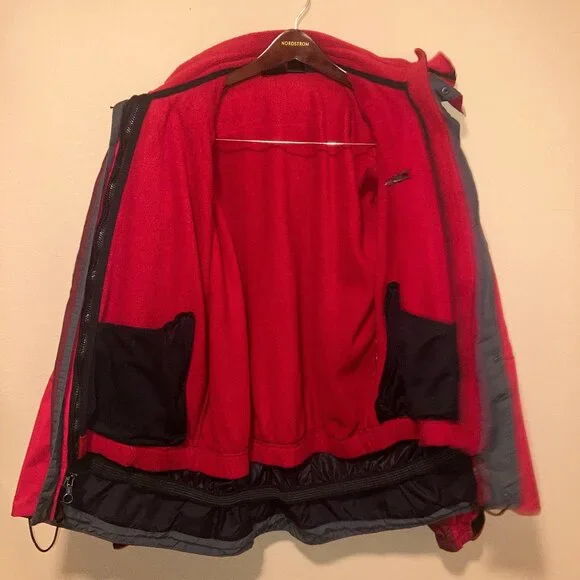 · Two-tone Red/Burgundy· Excellent Preowned Condition — Non-smoking home· Removable shell features water-repelling 2-layer Gore-Tex· Removable thermal fleece inner jacket zips in & zips out· Storm hood with brim inside collar· Zip interior & exterior pockets