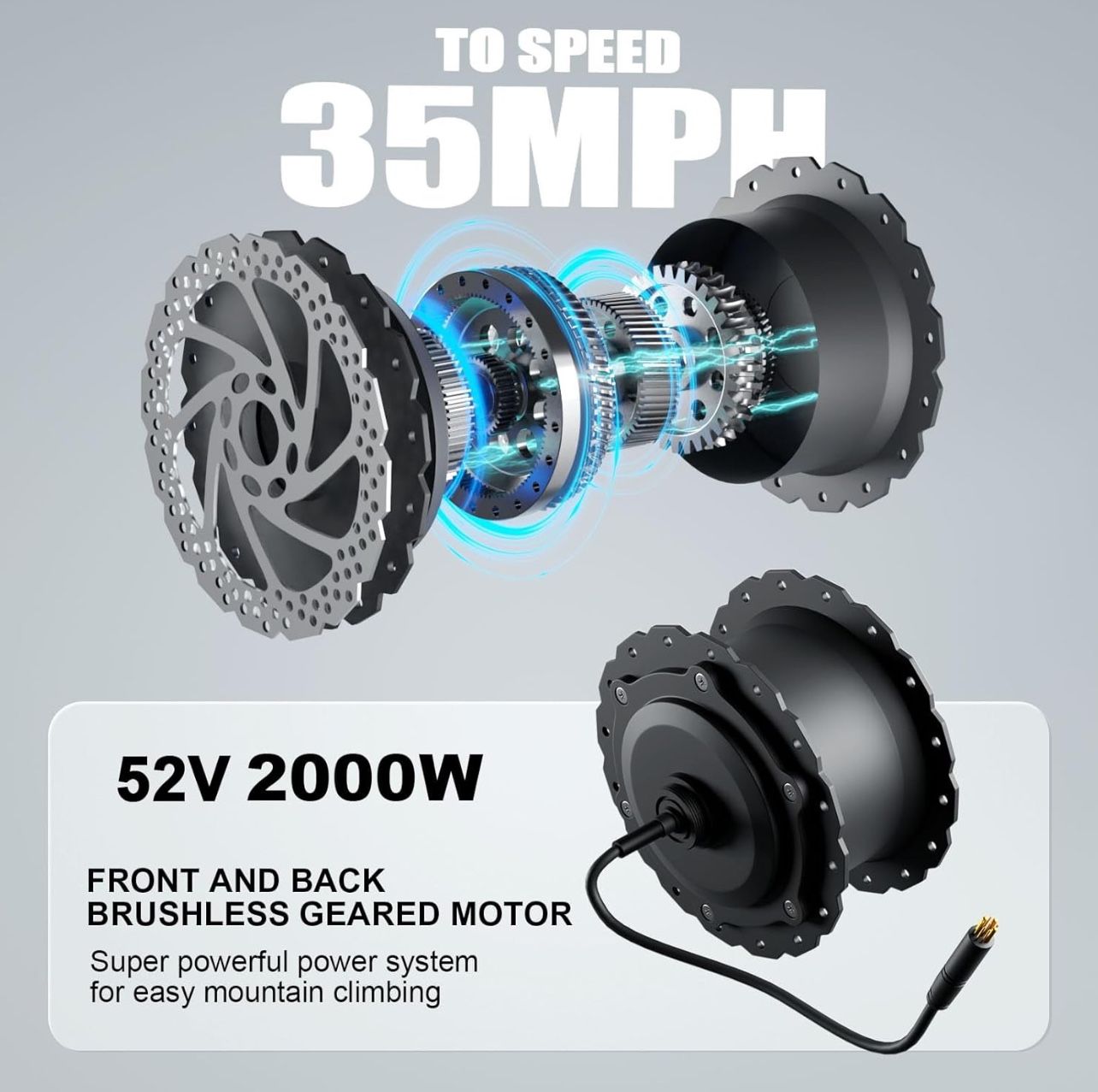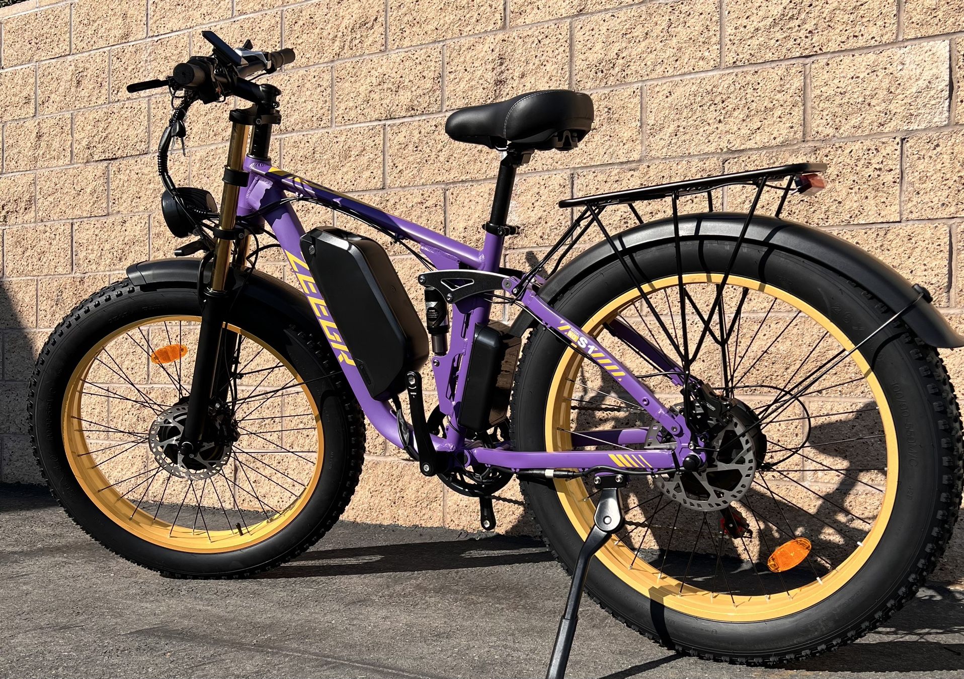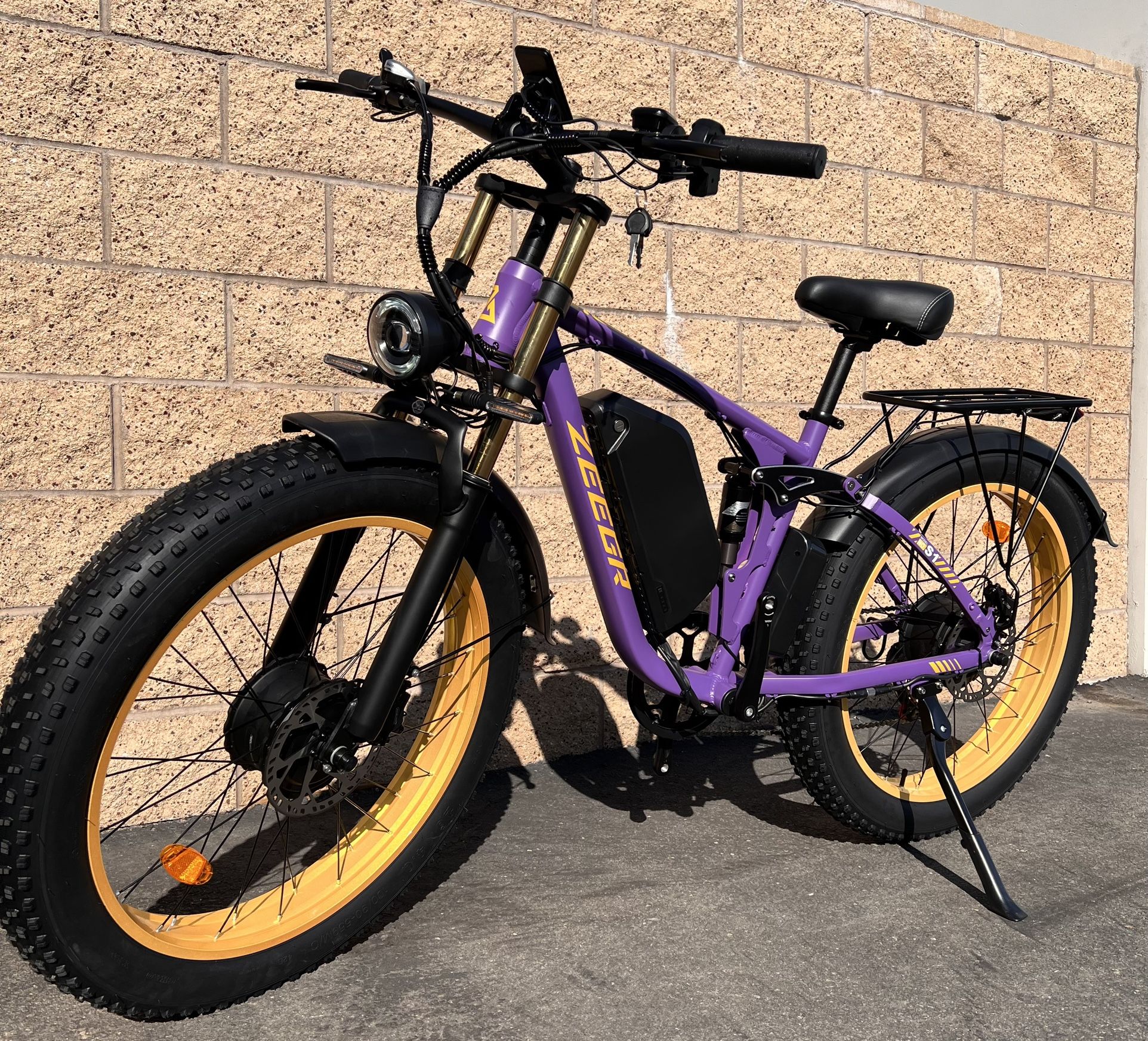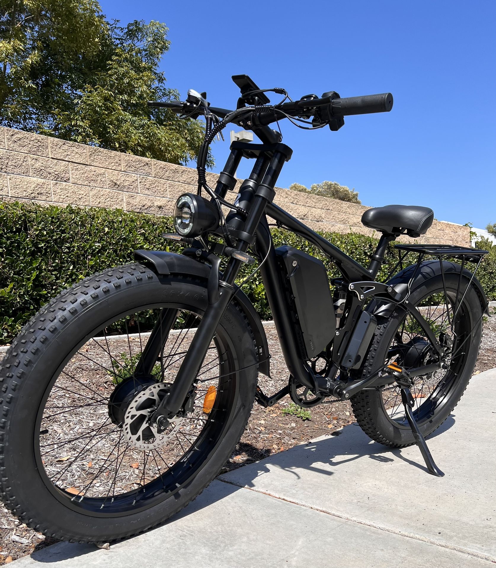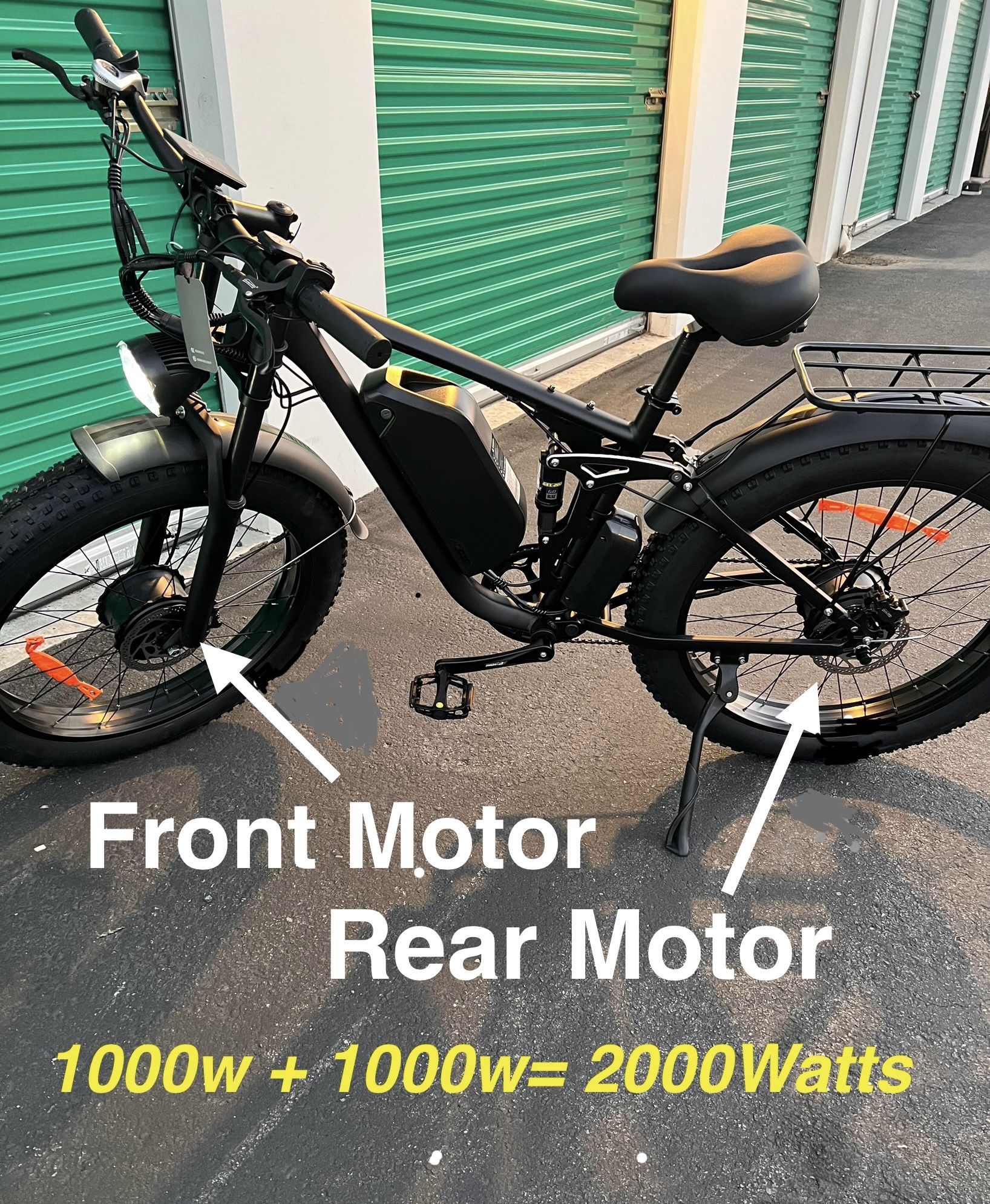 Price includes: Free Delivery, Tax Included, Fully Assembled/Professionally Tuned/ Pre-Quality Checked Ebike, 1 Year Warranty, Free Test Ride Before ANY Purchase 2000 Watt (2 x 1000 Watt Motor Each Front/Rear) (2500 Peak Watt) Electric Ebike180 N.M. Torque Motor Power (Low End Torque Reading)***THIS EBIKE IS A VERY POWERFUL/HIGH TORQUE EBIKE(180N.M. Torque)THAT CAN EASILY CLIMB THE STEEPEST OF TERRAIN//ALL WHEEL DRIVE/AWD/2WD/HAS 2 MOTORS/RIDES IN DEEP SAND AT THE BEACH/HEAVY GRAVEL/SOFT DIRT AREAS/NO PROBLEM***33-35mph Top Speed 30-45 mile range/distance (electric only/pedal assist)23ah Battery 26x4.0 (Fat Tire/Thorn Proof/Heavy Duty Tread)5’3-6’6 Rider Height 400lb Max Weight Capacity ***Hydraulic Disc Brakes***(Quicker Stopping/Shorter Stopping Distance -vs- Mechanical Disc Brakes)COLOR SCREEN/PHONE HOLDER/USB Port (Included Horn**TOGGLE MOTOR ON/OFF BUTTON (Shuts off front motor to conserve battery power by alternating battery power to only one motor hence getting a farther distance on the Ebike range when desired)Twist Grip - Throttle 5 Speed Electric Pedal Assist LevelsHeadlight/Tail LightLCD Screen/Speedometer 7 Speed Shimano Derailleur 18” inches from center of crank to bottom of seat post74” inches length of full bike (including tires)34”inches from ground to top of seat(lowered all the way) *** Warranty Covers***: 5 Year (Frame only)12,000 miles (motor only)1 Year (Contoller/Screen/Battery/Electronics)***DUAL MOTOR/2000Watt Electric Fat Tire Mountain Ebike***(Black or Purple/Gold)