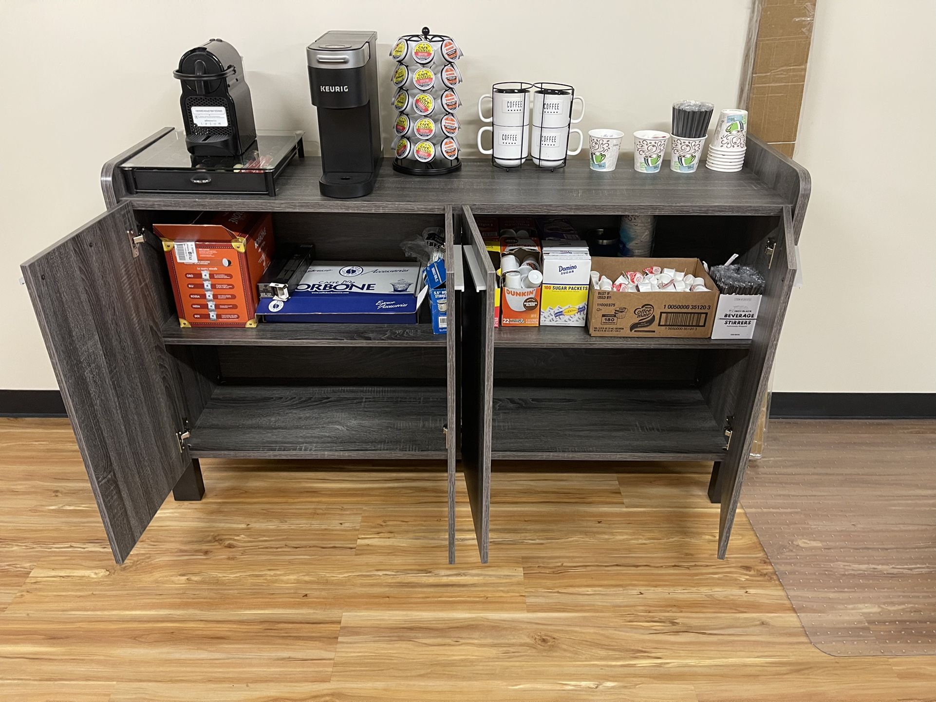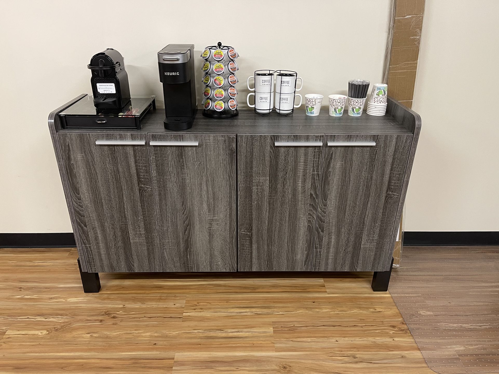 Brand new. Never used. Needs assembly. Picture of the credenza is one in my office. I’m selling the one in the box that is not assembled. It’s the sameOne you see in the pictures. Any questions feel free to contact me