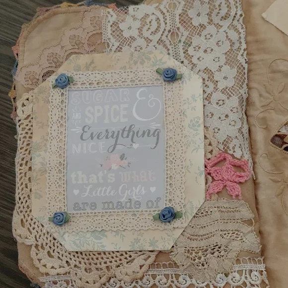 This beautiful vintage-inspired art piece features delicate pink and cream accents, perfect for adding a touch of elegance to your home decor. The intricate design invites you to dance, sing, and laugh, making it a charming addition to any room. Can be personalized to be your own. I didn´t have room in photos to add the last page. Smoke-free home.