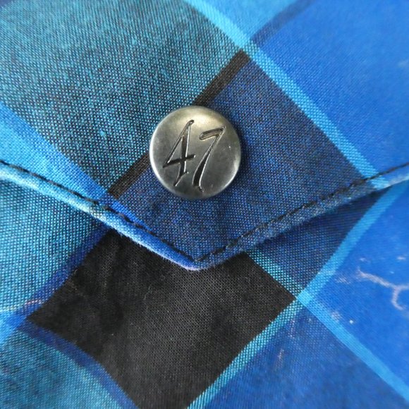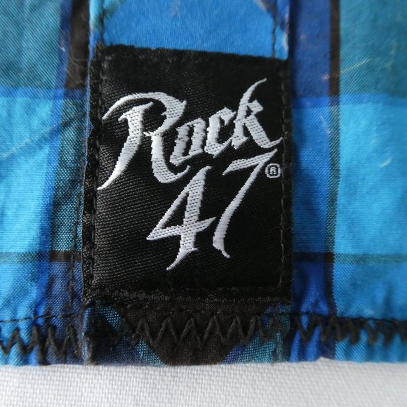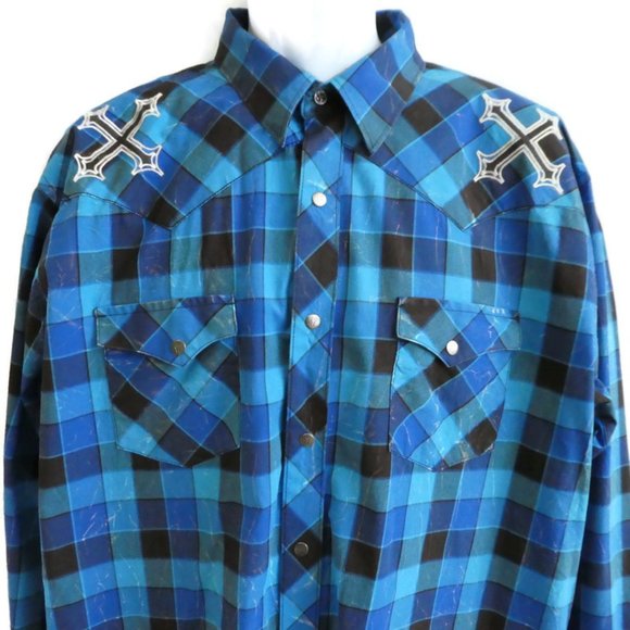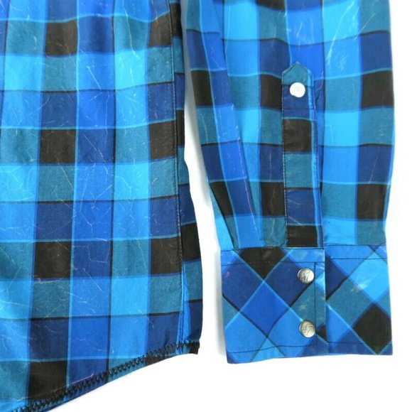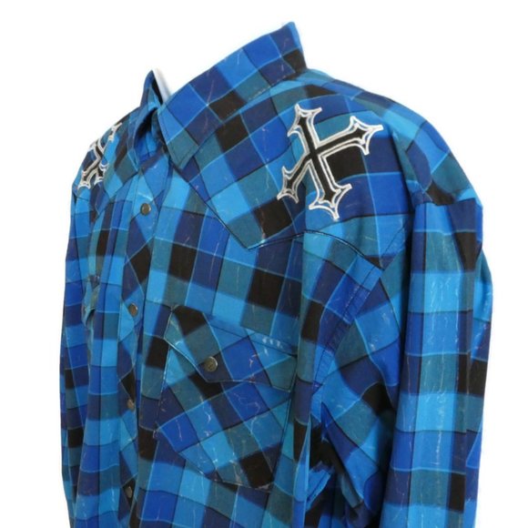 Wrangler Rock 47 Western Shirt Snaps Peaks Pockets. Blue Plaid. Embroidered Shoulder Crosses. 100% Cotton. Made in Bangladesh. Machine Wash. Tagged Size XL.Chest: 26" x2 flat across underarms NO stretchShoulders: 22"Sleeves: 28"Length: 32"Condition: Preowned. Great Condition. NO stains. Intentional Salty Designs. NO holes/rips. Ready to Giddy Up!Tbin geminitiger7anth Vintage Style Cowboy Rodeo City Slicker Dapper Yellowstone Rancher Dude Ranch Crosses Xs.FAST SHIPPER ** ships UPSP Priority same or next business day.**Pricing Preowned depends on STYLE, Fabric Content, Condition, Vintage Age, Scarcity & Brand. Items are priced to Sell. Offers are rarely sent.