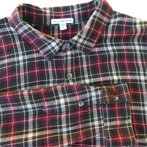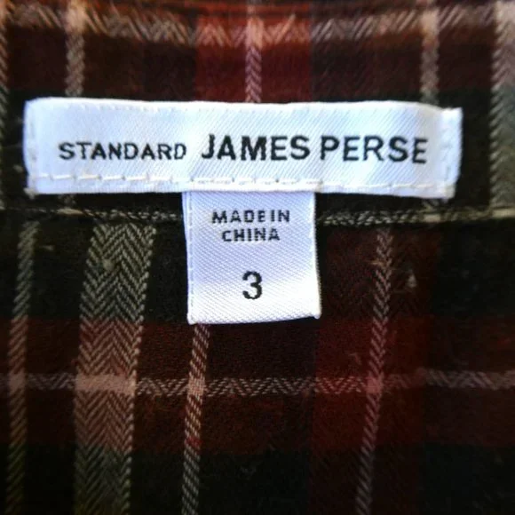 James Perse Brown Plaid Shirt Cotton Blend. Long Sleeve. Button Front . Back Hanging Loop. Inverted Pleats. Cotton plus 1% Spandex. Tagged Size 3. Converts to US Size L.Chest: 24"x2 flat across underarmsShoulder: 21"Sleeve: 27"Length: 30"front 32"backCondition: Preowned. Great Condition. NO stains/holes/rips. Soft!R3slf 7.1oz P1420050p geminitiger7anth Lightweight Flannel Dapper Outdoor Farmhouse PremiumBRAND NEW to ? Enter code GEMINITIGER7 at checkout for $10 off your FIRST PURCHASE