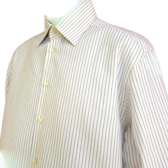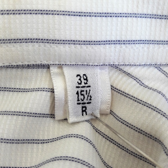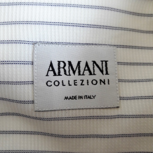 Armani Collezioni Italy Shirt Button Front Stripes. Tagged size 39 15 1/2 R.Chest: 23"x2 flat across underarmsShoulder: 23"Sleeve: 24"Length: 31"Condition: Preowned. Great Condition. NO stains. NO holes/rips. Note: Pics taken outside. NO yellowing on this garment.geminitiger7dez designer Career dressy professionalwit