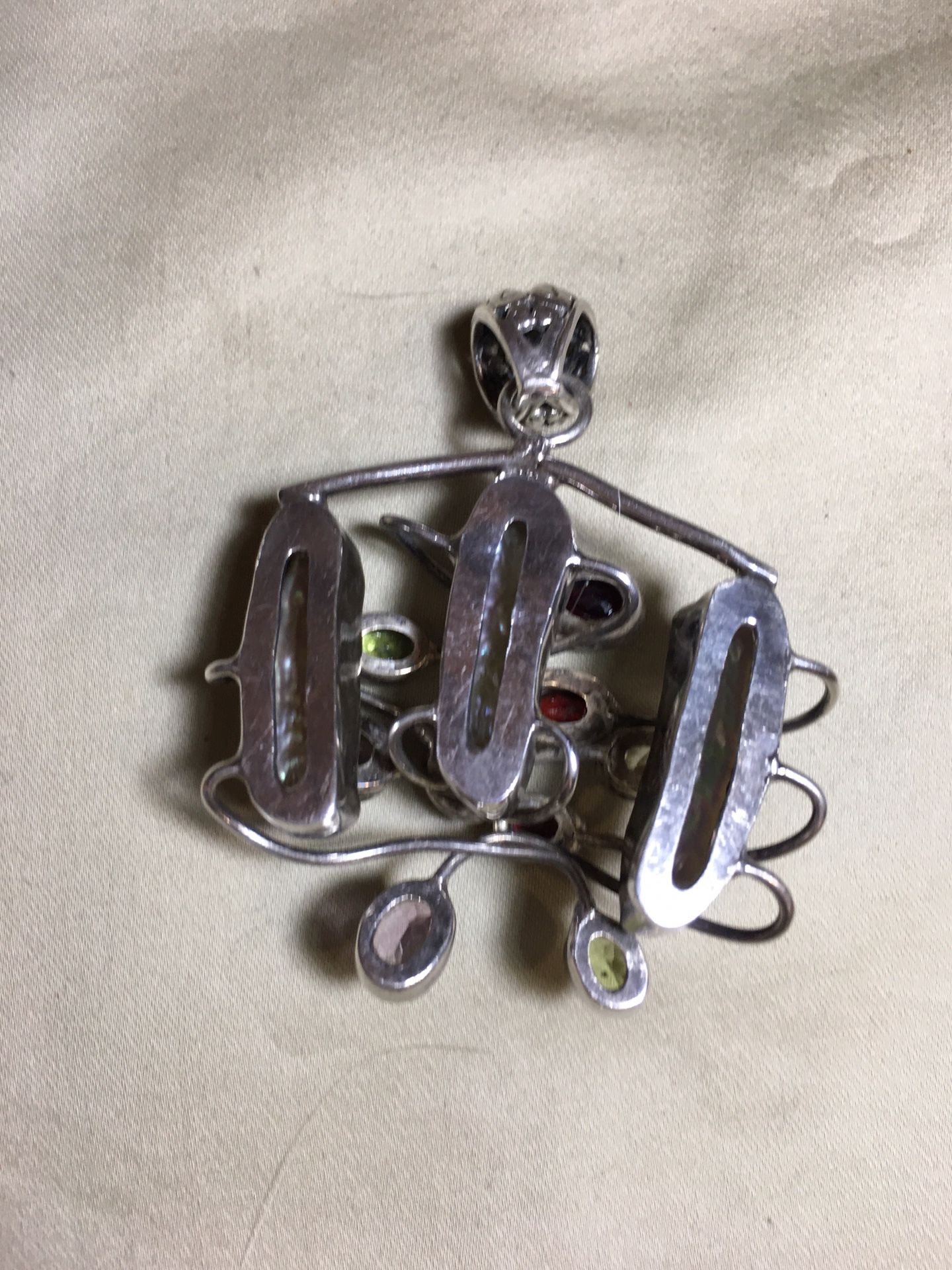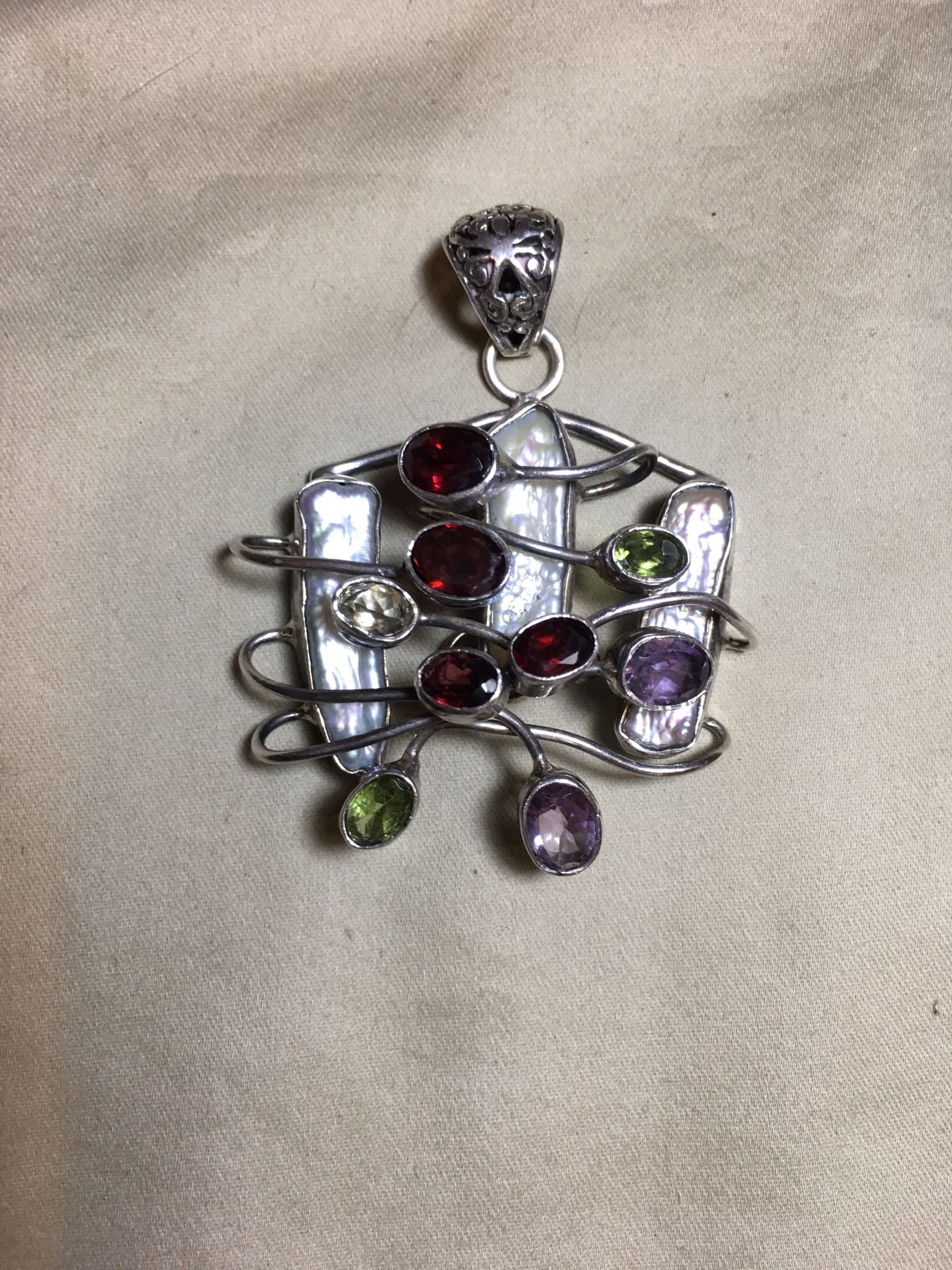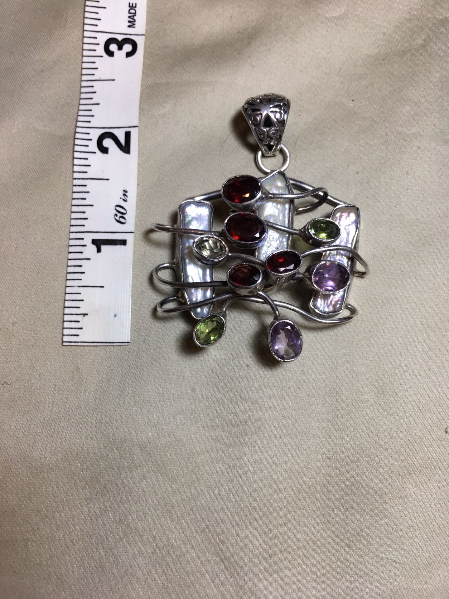 For sale is a modernist 925 stamped sterling silver pendant with 3 baroque pearls, 3 citrines, 3 garnets, and 3 amethysts. It measures 2.5” long by 1 3/4” wide by 3/4” deep and weighs 26 grams. It is in very good condition.