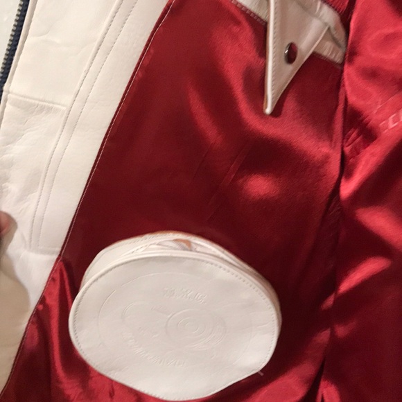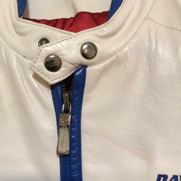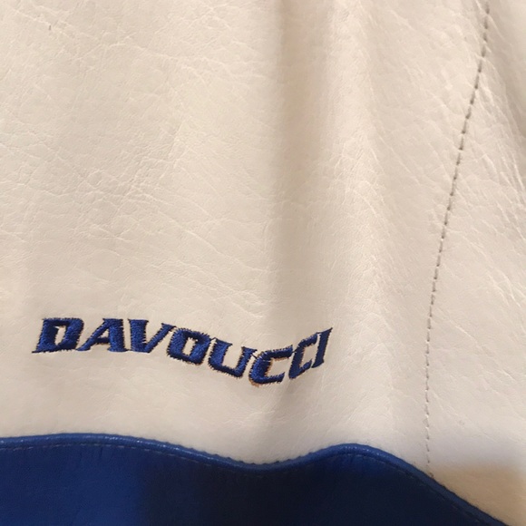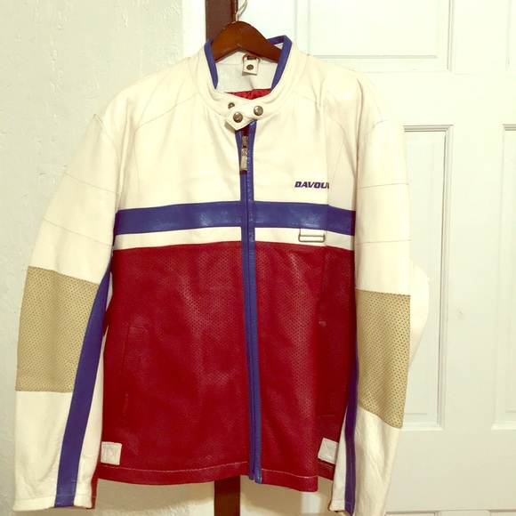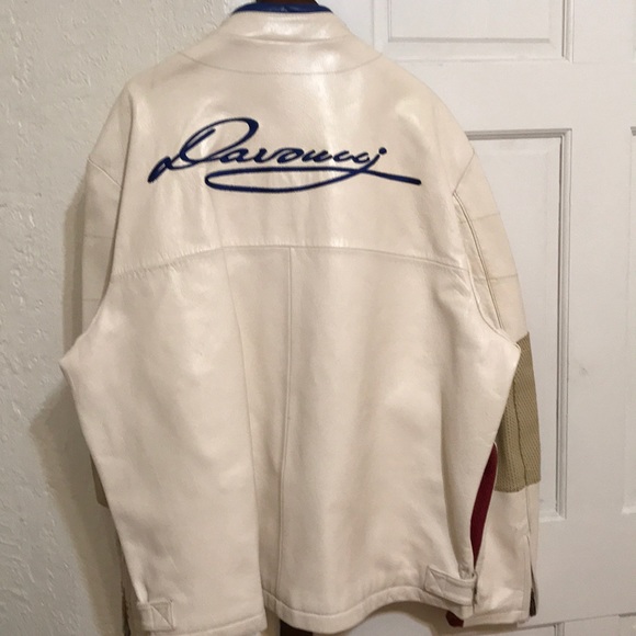 Perfect for Spring or Fall!Men’s Leather Racing Jacket by Davoucci.Size 4XL.Worn a few times.A little wear on the sleeves but otherwise still in very good condition.Interior and exterior pockets.