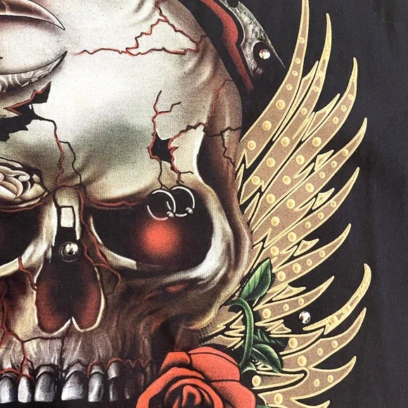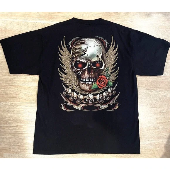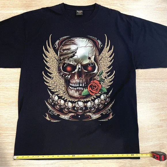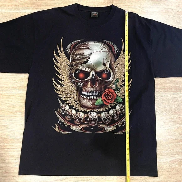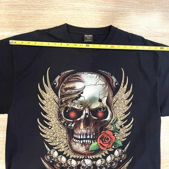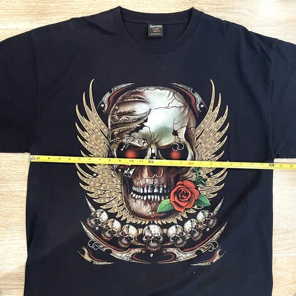 Vintage 90s Y2K Survivors Skulls 3D Wings Rose Studs & Piercings T-Shirt100% CottonBlackCrew NeckShort SleeveDouble Sided Graphic Print (front and back) Large Skull with Puffy 3D Angel Wings, Red Rose in Teeth, Small Skulls Along BottomLarge Skull has Silver Studs in various places a 3D Silver Barbell Eyebrow PiercingMen´s Size XXL24" shoulder to shoulder24.5" armpit to armpit (chest)10" sleeve length9" sleeve opening32" full length from shoulder to hem25.5" hemMeasurements made with garment laying flatBe sure to measure before purchase to ensure accurate fit and to avoid returns due to item not fitting!Excellent vintage brand new, never worn condition. Does not have original tags.No rips, tears, stains, holes, fading or other notable flawsClean and from a smoke free home.