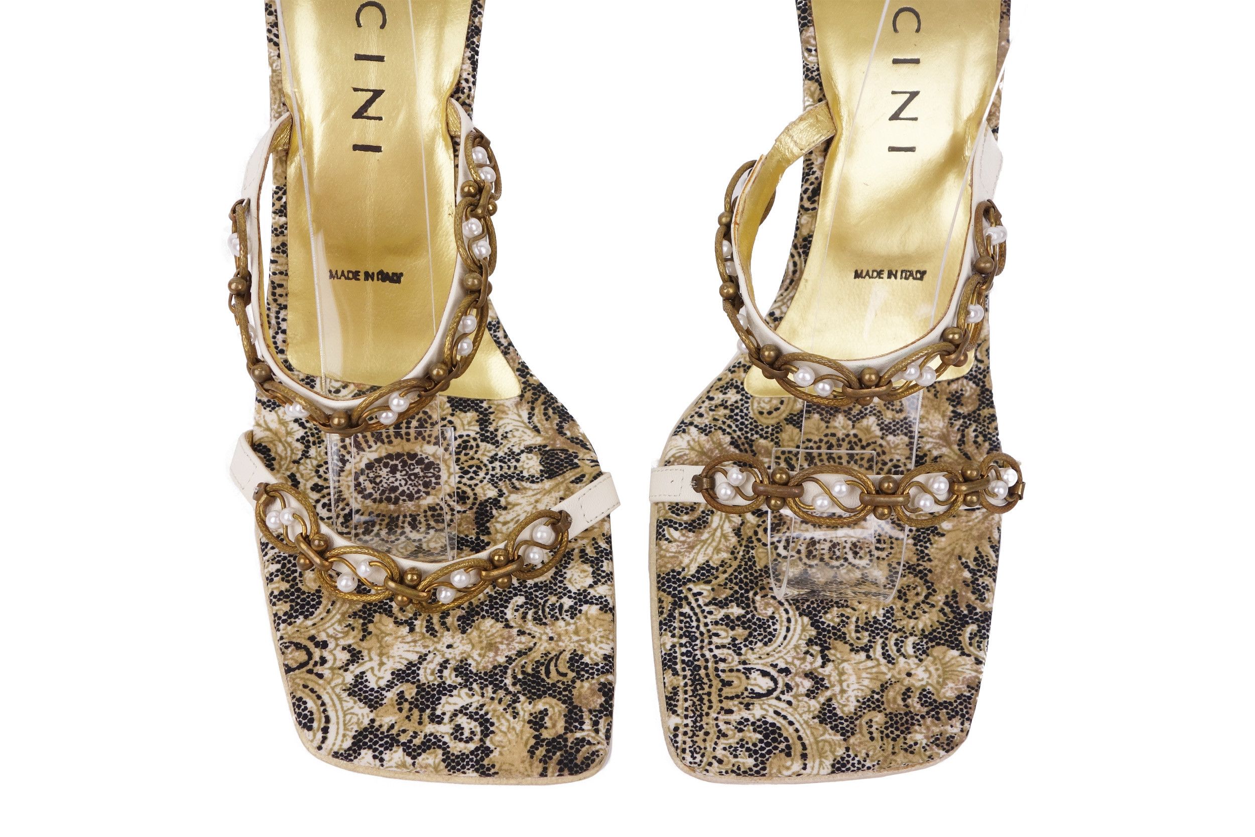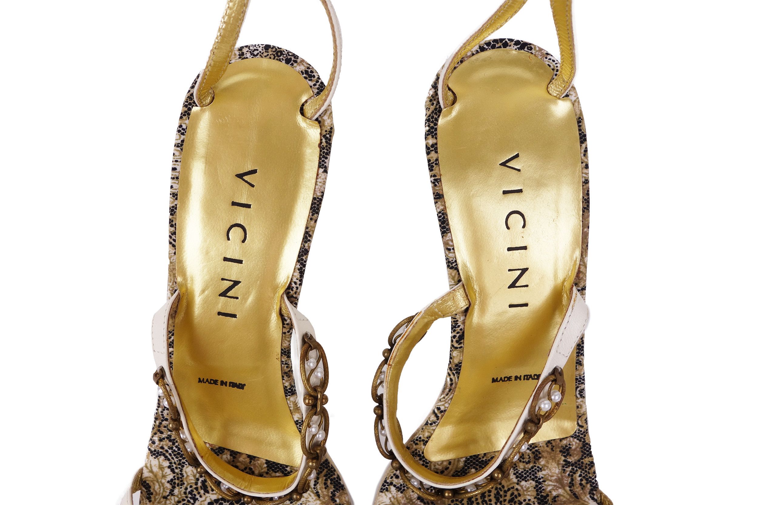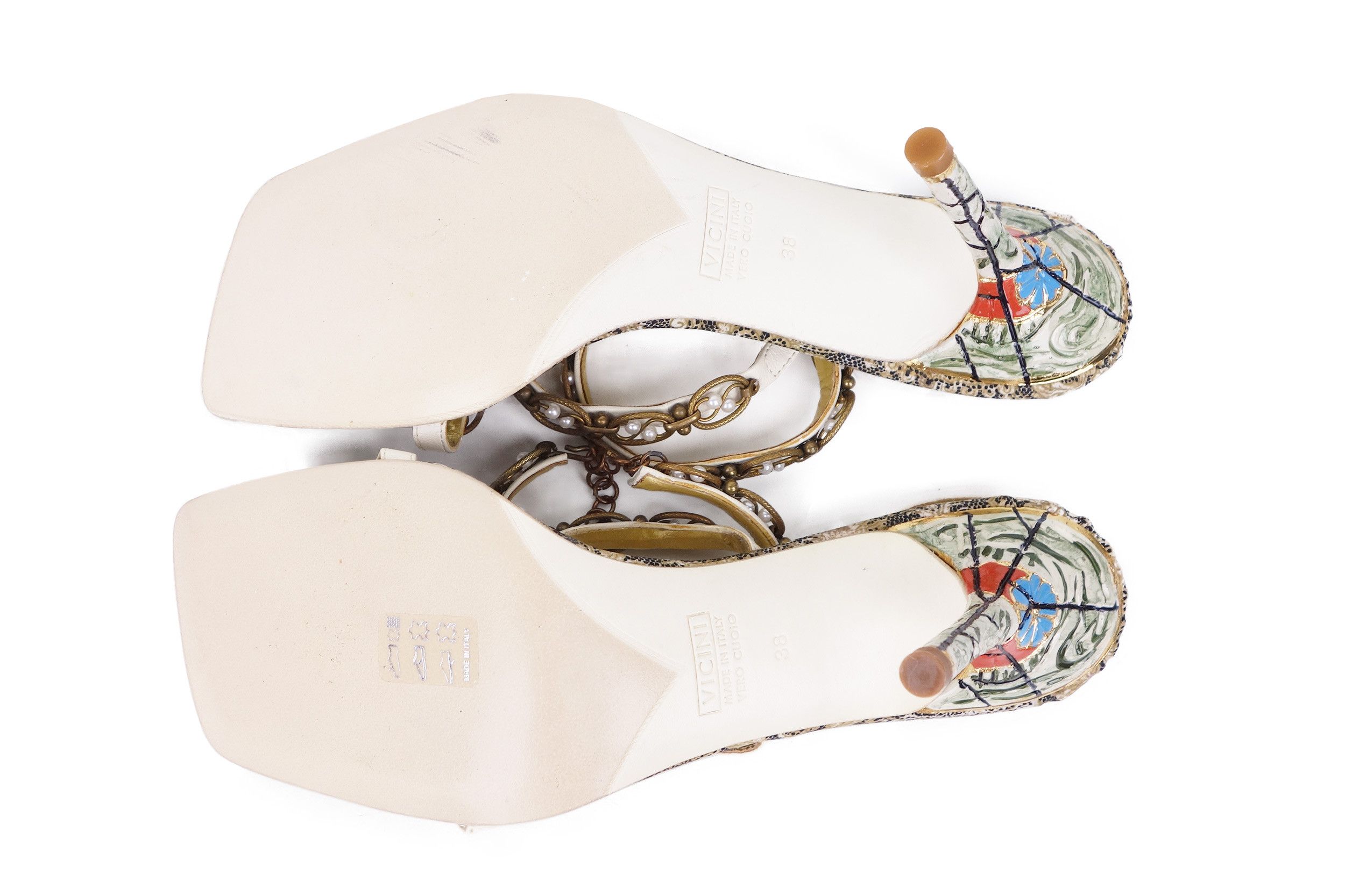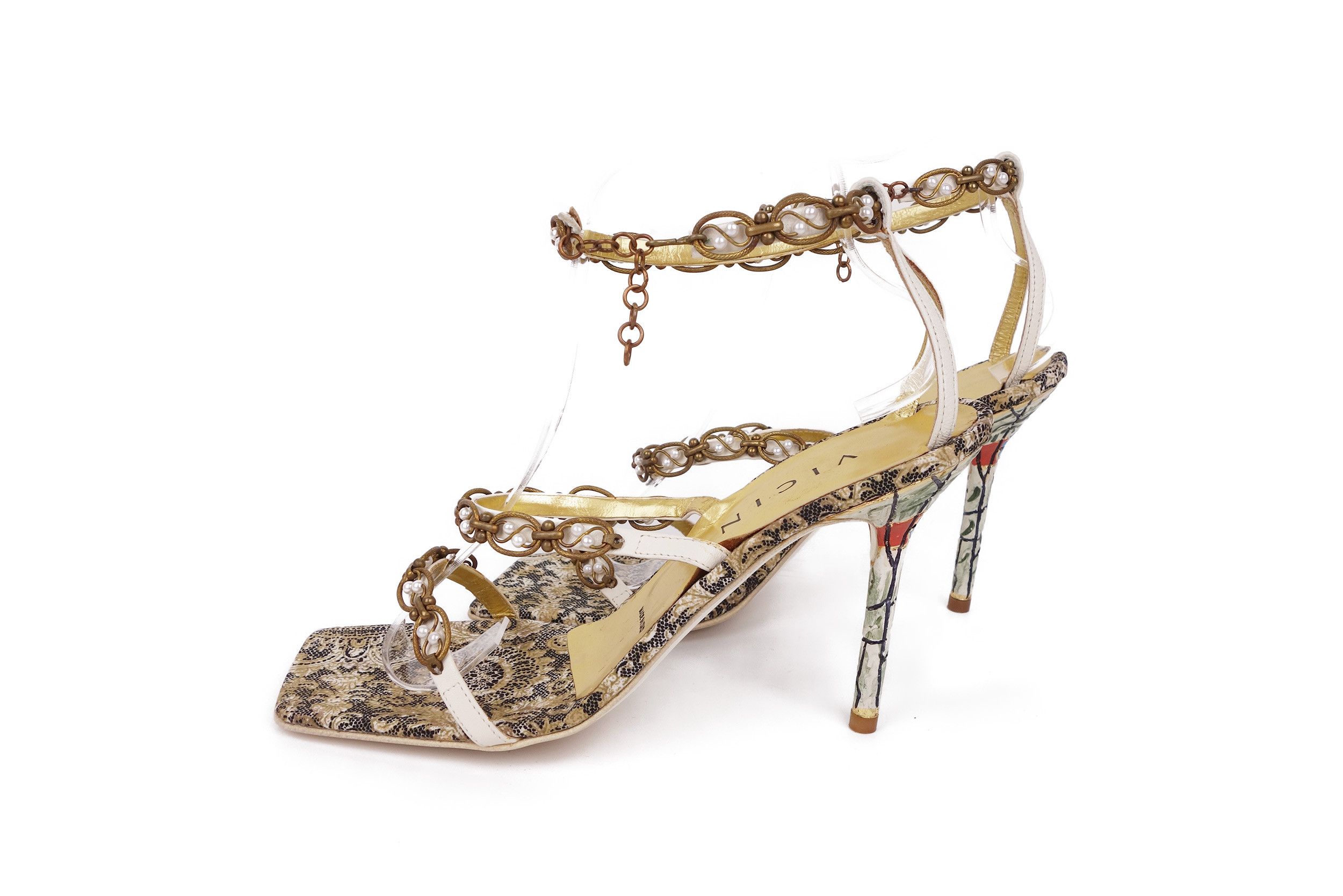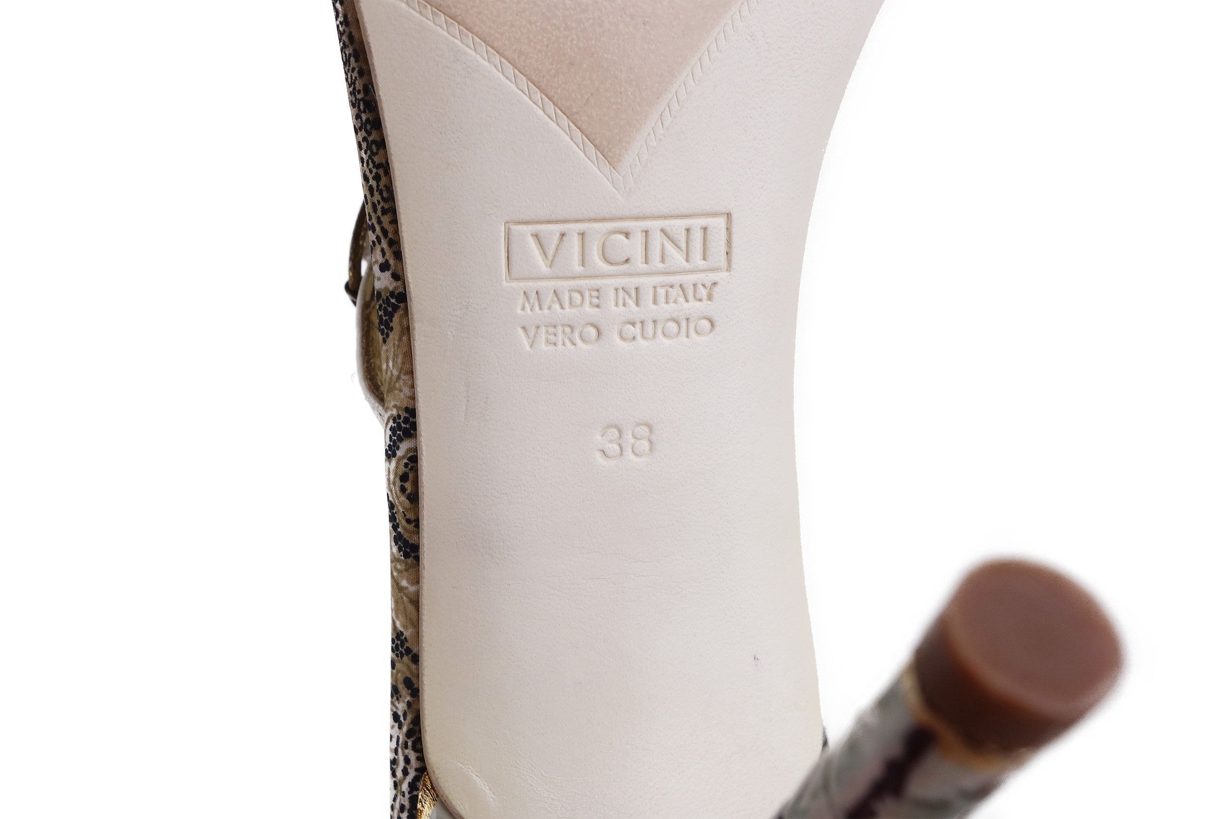 New Vintage Vicini design by . embellished strappy sandals with painted heels.Size 38Insole: 9,8" / 25 cmHeels: 4,1" / 10,5 cmNever worn.
