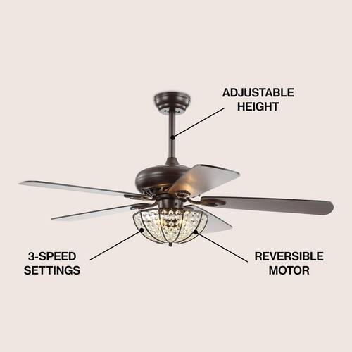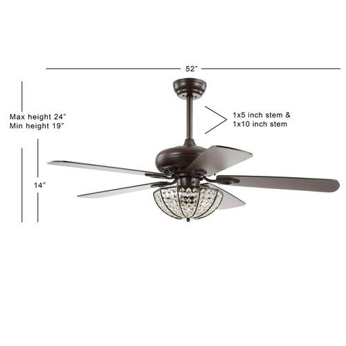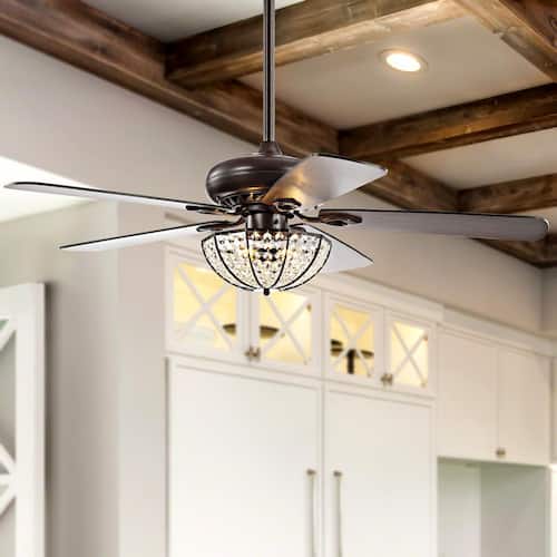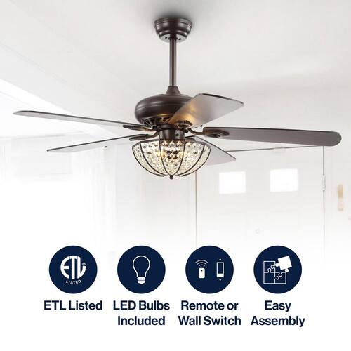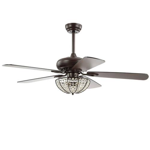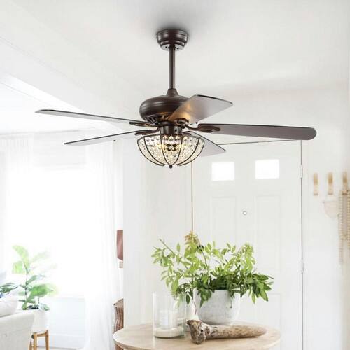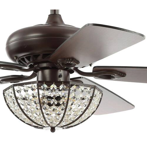 About This Product:Our 52 in. Oiled Bronze fan combines rustic style and a touch of glam, featuring a domed cage light embellished with crystal drops. Five reversible blades provide plenty of air flow by remote control. Three LED bulbs provide bright, sparkling light.