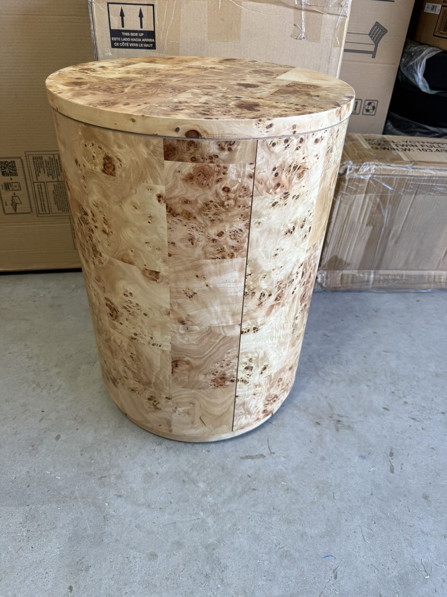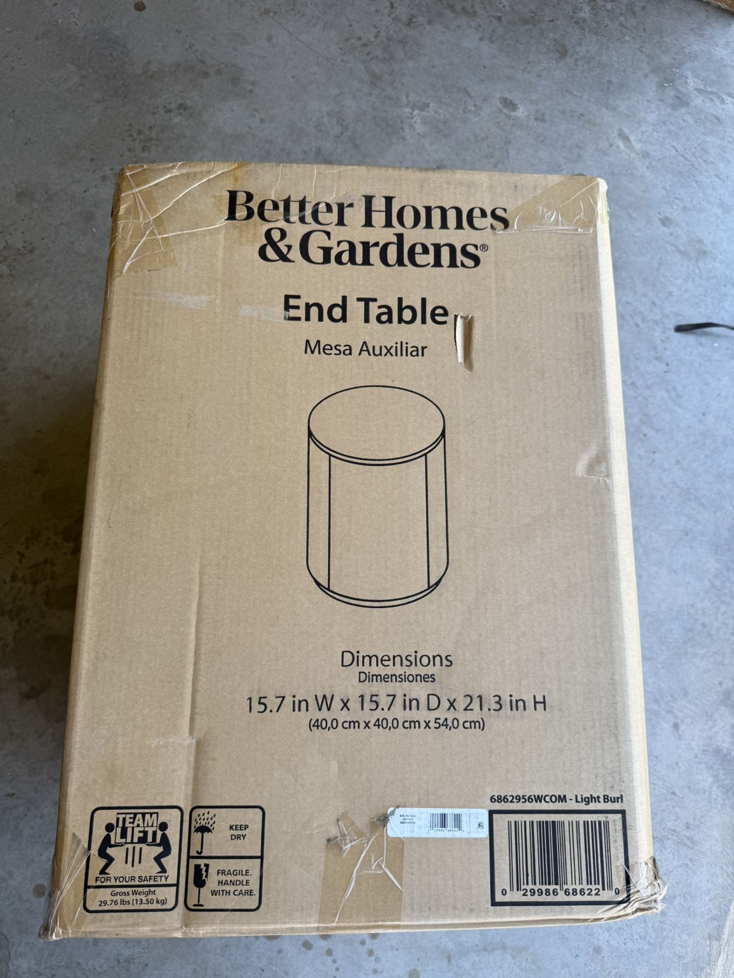 Brand new and several availableUpgrade your space with the Better Homes & Gardens Burlwood End Table, featuring a stunning swirled grain pattern and real burlwood veneer over a sturdy MDF frame. Each piece is one-of-a-kind, adding warmth and texture to any room. This versatile end table functions as a sofa side table, bedside nightstand, or accent table, fitting seamlessly into your living room, bedroom, office, or entryway. The round tabletop provides space for books, lamps, or decorative accents, or keep it minimal for a modern look. No assembly required—just unbox and enjoy! Pair it with matching pieces from the Better Homes & Gardens Burlwood Collection for a cohesive, natural aesthetic.Better Homes & Gardens Burlwood End Table:Assembled Dimensions: 15.75” L x 15.75” W x 21.26” HProduct Weight: 22 lb Color: Light burlwoodMaterial: Engineered wood, MDF framePackage Dimensions: 19.25" L x 19.25" W x 24" HBohemian styleBetter Homes & Gardens ‘Burlwood’ Collection One-of-a-kind natural burlwood surface Round design No assembly required