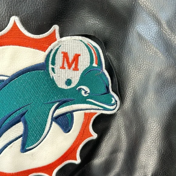 Size XL vintage Miami Dolphins leather jacket - has one small tear on the back near the logo that needs repaired but otherwise in great condition