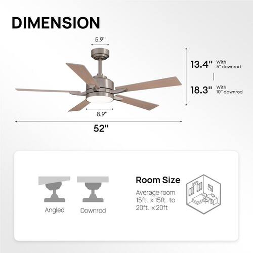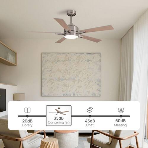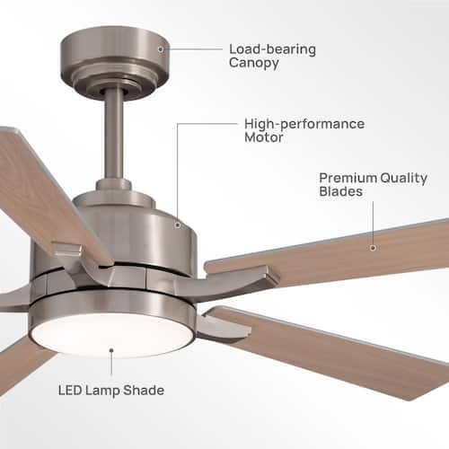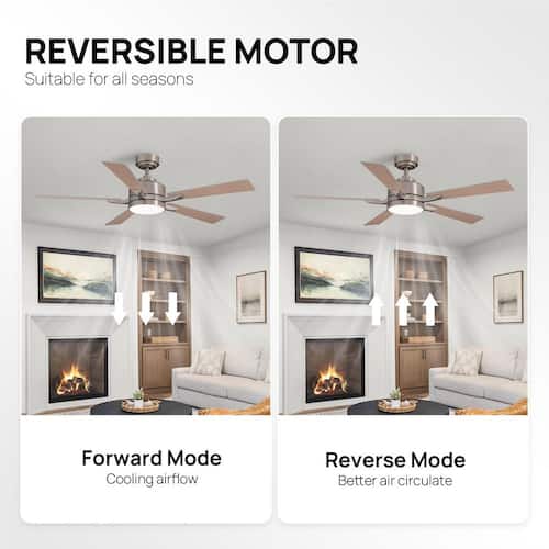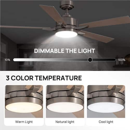 About This Product:This 52 in. Modern Ceiling Fan with LED Light and Remote Control is the perfect union of performance and sophistication. Designed for comfort and energy efficiency, this fan features a powerful DC motor, ultra-quiet operation, and 5 sleek reversible blades in a natural wood tone. Whether cooling down during summer or recirculating warmth in winter, this fan keeps your space comfortable year-round. The dimmable LED light with adjustable color temperature brings versatile illumination to your living room, bedroom, or office. With remote, wall, and app control options, convenience is always at your fingertips.